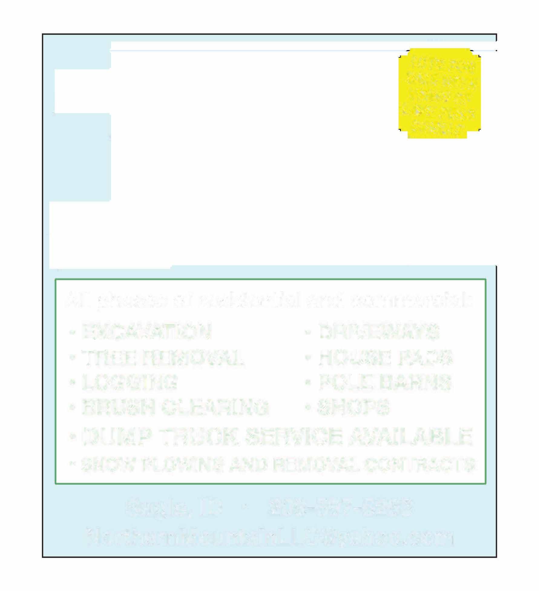§ALLOT§FOR Ewm,LVIEW§OF Al(EpENO OREILLE All phases of residential and commercial: • EXCAVATION •DRIVEWAYS •TREE REMOVAL •HOUSE PADS •LOGGING • POLE BARNS •BRUSH CLEARING • SHOPS •DUMP TRUCK SERVICE AVAILABLE • SNOWPLOWINGAND REMOVALCONTRACTS Sagle, ID • 208-597-5263 NorthernMountainLLC@yahoo.com