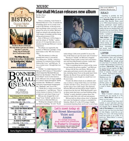 Marshall McLean. Courtesy photo. makes things a little more portable for me as the face of the band so I can tour more solo if I need to.” Playing on “SoDak” are McLean’s longtime bandmates Justin Landis on bass and vocal harmonies and Jesse MacDonald on drums. Landis also co-produced the album with McLean. “This is something that we conceived the vision for and started the process together,” said McLean. Along with the bass and drums, McLean had some guest performers record in the studio with him, including Jamie Frost on the pedal steel, Fawn Butcher, the Shook Twins and the band Joseph. McLean plans to join Joseph on a small tour over the next week. Overall, the album struck me as authentic and easy to listen to. Songs build when you want them to build, and take it away, always leave you wanting the song to last a little longer. The chemistry between McLean and bass player Justin Landis is evident from the first lick. With MacDonald’s spoton drum tracks that keep your head bobbing along, “SoDak” is surely destined to please those who search for indie folk rock with soul and purpose. McLean held an album release show in Spokane last week, but Sandpoint’s release is scheduled for Saturday, March 25, at the 219 Lounge. I highly recommend checking them out if you’ve never been.
