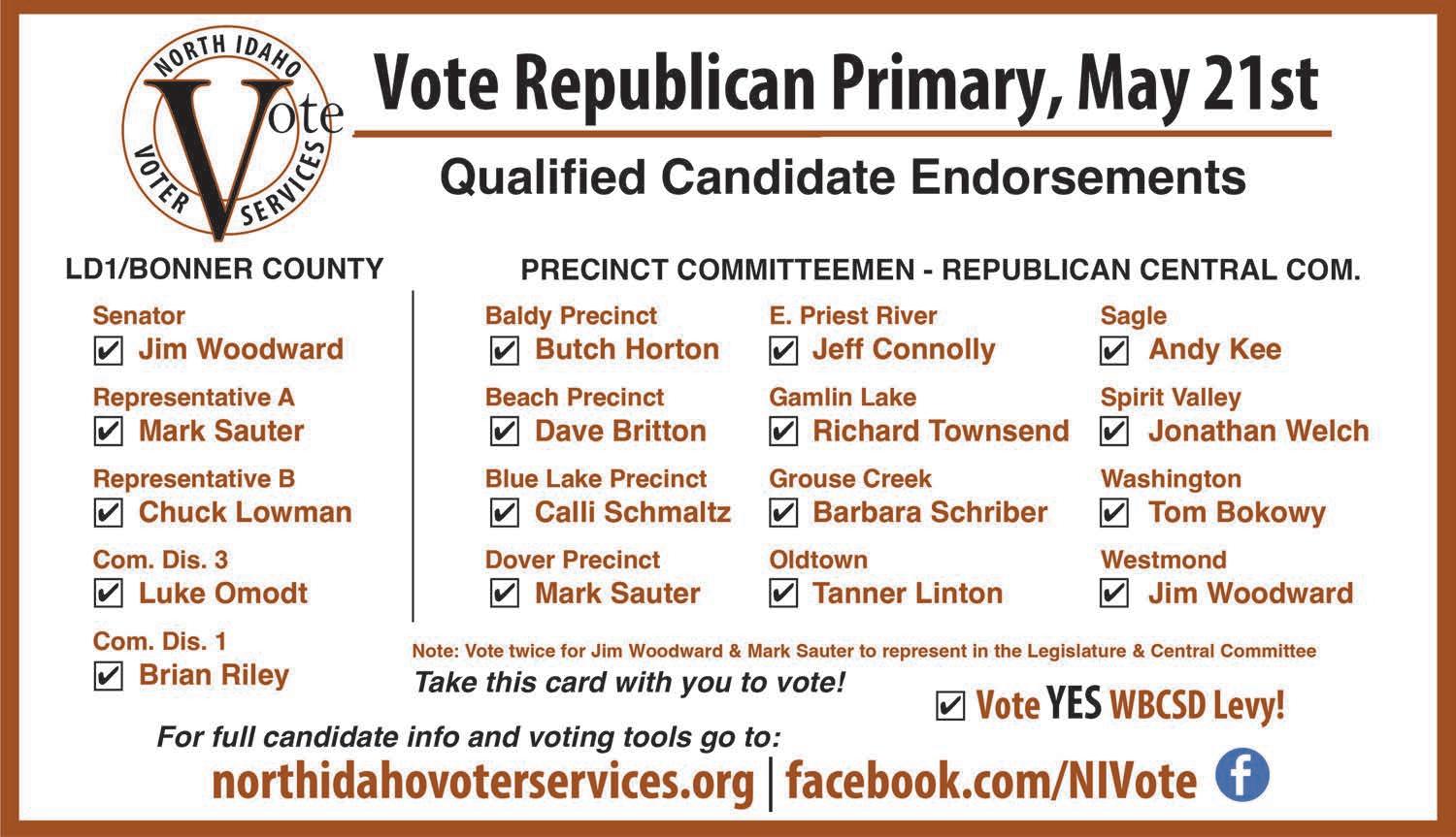 Thank you to all of those who showed up for the two candidate forums hosted by KRFY, sandpointonline.com, the Bonner County Daily Bee, Selkirk Association of Realtors and the Sandpoint Reader earlier this week. If you missed the forums, fear not: KRFY.org will have them posted under “podcasts.” This week, the Reader presents a two-page breakdown of the April 29 forum featuring candidates for Bonner County commissioner Districts 1 and 3 races as well as the Bonner County sheriff’s race. In the May 9 edition, the Reader will follow up with another two-page recap sharing results from the April 30 forum featuring Idaho Legislative District 1 Senate and House 1A/1B candidates.