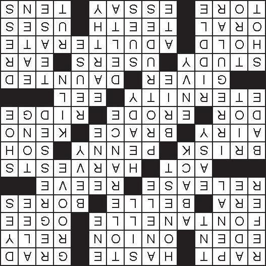 1.Absorbed 5.Undue speed 10.Alumnus 14.Biblical garden 15.An aromatic flavorful vegetable 16.Depend upon 17.Soft spot of a baby’s head 19.Curved molding 20.Chapter in history 21.Young lady 22.Drills 23.Set free 25.Female ruff 27.Play a role 28.Times of reaping 31.Quick and energetic 34.One cent coin 35.Between FAH and LAH 36.Breezy 37.Support 38.Bingo relative 39.Dung beetle 40.Wear away 41.Chain of hills 42.Forever and a day 44.Snake-like fish 45.Donor 46.Intimidated 50.Examine 52.Utilizers 54.Hearing organ 55.Retain 56.Corrupt 58.By mouth