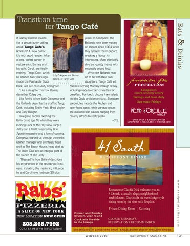 If Barney Ballard sounds years. In Sandpoint, the like a proud father talking Ballards have been making about Tango Café’s an impact since 1984 when (263-9514) new owner, they opened The Cupboard, it’s with good reason. After creating a legacy for a long, varied career in interesting, often ethnically restaurants, Barney and diverse, quality menus with his wife, Carol, are finally modestly priced food. retiring. Tango Café, which While the Ballards head Judy Colegrove and Barney off to be with their own he started two years ago Ballard, of Tango Café daughters, Tango Café will inside the Panhandle State continue serving Monday through Friday, Bank, will live on in Judy Colegrove. including made-to-order omelettes for “Like a daughter,” is how Barney breakfast. For lunch, choose from salads describes Colegrove. like the Cobb or Asian ahi tuna. Signature Like family is how both Colegrove and the Ballards describe the staff at Tango sandwiches include the Reuben and Café, including Shelly Yeck, Brad Vogler open-faced steak, while various pastas and Gary Baughn. are available with sauces ranging from Colegrove recalls meeting the creamy alfredo to zesty pesto. Ballards at age 16 when they were –C.S. running Dock of the Bay (now Jorge’s Jetty Bar & Grill). Inspired by Bon Appetit magazine and a love of cooking, Colegrove worked up through the ranks: kitchen manager and eventually head chef at The Beach House, head chef at The Idaho Club and an integral part of the launch of The Jetty. “Blessed” is how Ballard describes his experiences in the restaurant business, including the mentoring influence he and Carol have had over 30-plus