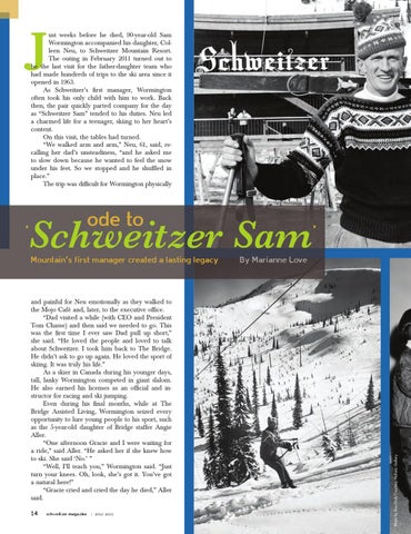 and painful for Neu emotionally as they walked to the Mojo Café and, later, to the executive office. “Dad visited a while (with CEO and President Tom Chasse) and then said we needed to go. This was the first time I ever saw Dad pull up short,” she said. “He loved the people and loved to talk about Schweitzer. I took him back to The Bridge. He didn’t ask to go up again. He loved the sport of skiing. It was truly his life.” As a skier in Canada during his younger days, tall, lanky Wormington competed in giant slalom. He also earned his licenses as an official and instructor for racing and ski jumping. Even during his final months, while at The Bridge Assisted Living, Wormington seized every opportunity to lure young people to his sport, such as the 5-year-old daughter of Bridge staffer Angie Aller. “One afternoon Gracie and I were waiting for a ride,” said Aller. “He asked her if she knew how to ski. She said ‘No.’ ” “Well, I’ll teach you,” Wormington said. “Just turn your knees. Oh, look, she’s got it. You’ve got a natural here!” “Gracie cried and cried the day he died,” Aller said. 14