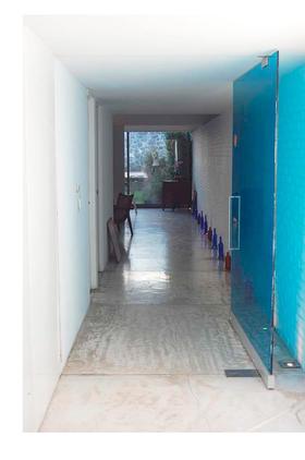 SE LLEGA DIRECTAMENTE A UN GRAN ESPACIO, INUNDANDO POR LUZ DEL GRAN VENTANAL HACIA EL JARDÍN TRASERO, EN LO QUE CONSTITUYE EL CORAZÓN DE LA CASA CUIDADOSAMENTE DISEÑADA. POR SU PURISMO, DESTACAN LOS. SUTILES ACENTOS DE LOS ESCASOS ELEMENTOS (CHIMENEA, ESCALERA Y EL CAMBIO DE NIVEL QUE SEPARA LA SALA Y COMEDOR) Y SOBRE TODO, LOS MATICES DE SOMBRAS QUE PRODUCEN LAS DOS BÓVEDAS DE CONCRETO, ESTE TIPO DE CUBIERTA PERMITÍA, ABARATAR COSTOS Y ERA A SU VEZ UN SIGNO INEQUÍVOCO DE MODERNIDAD.