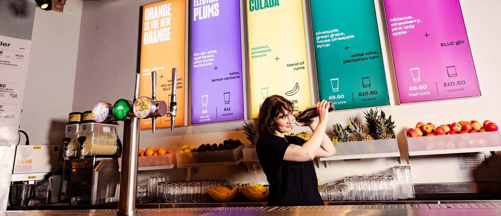 Stocked with the highest quality spirits from East London Liquor Co. and craft beer from Gipsy Hill Brewery alongside freshly made juices and cocktails.