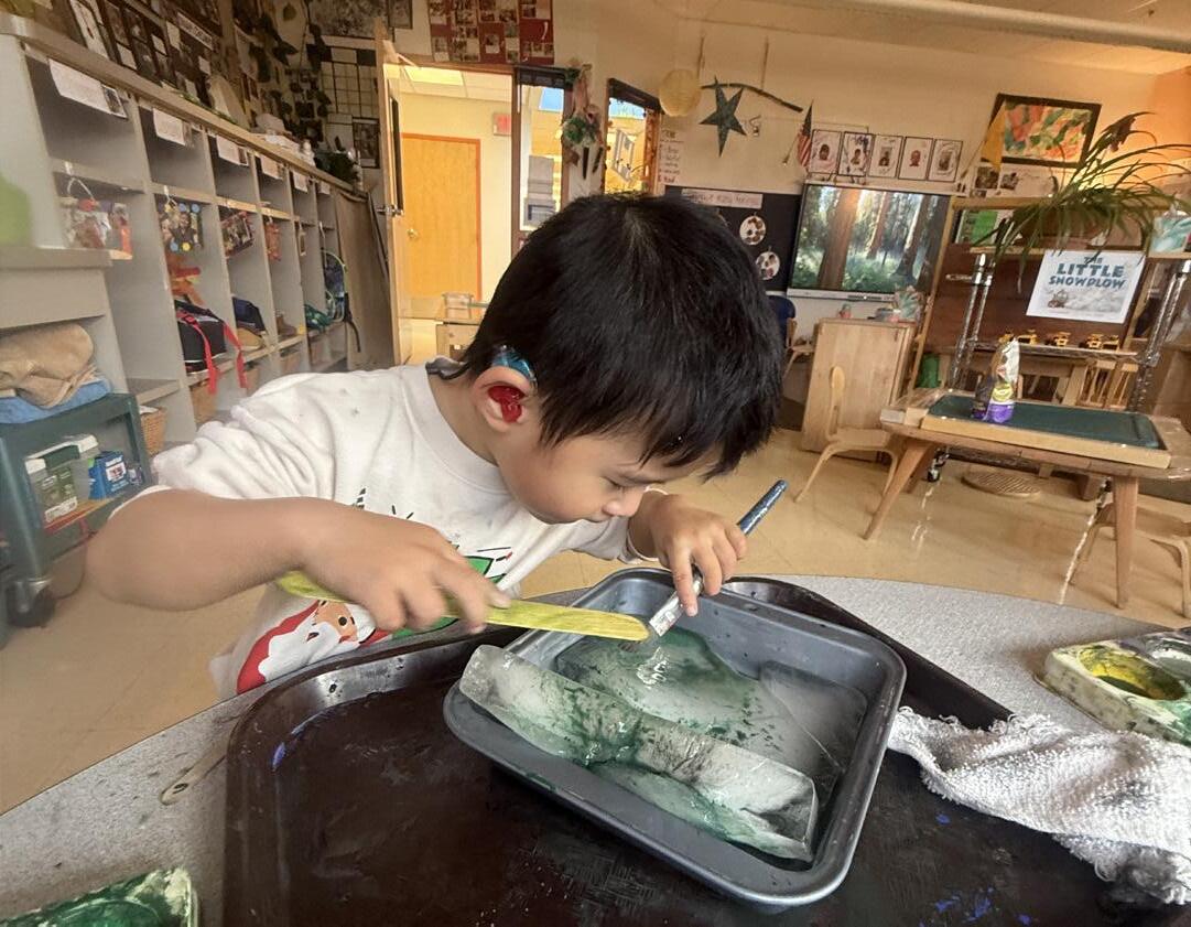 In another activity, students used watered down clay to paint. Ander Bellah noticed the chunky clay on his paint bush. He studied the clay as it met his paper. Ezekiel Ten studied his clay covered hands as they dried and began to crack. The knowledge acquired in this manner sticks, laying a stronger foundation for future learning. Each discovery sparks excitement and curiosity.