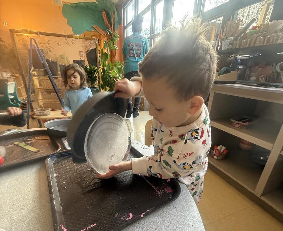 Oh! How important it is to have opportunities for children to learn from each other. Students were invited to explore ice in baking pans and watercolor paint. They began by painting the ice, but soon grew tired of simply coloring it and wanted to explore the ice in different ways.