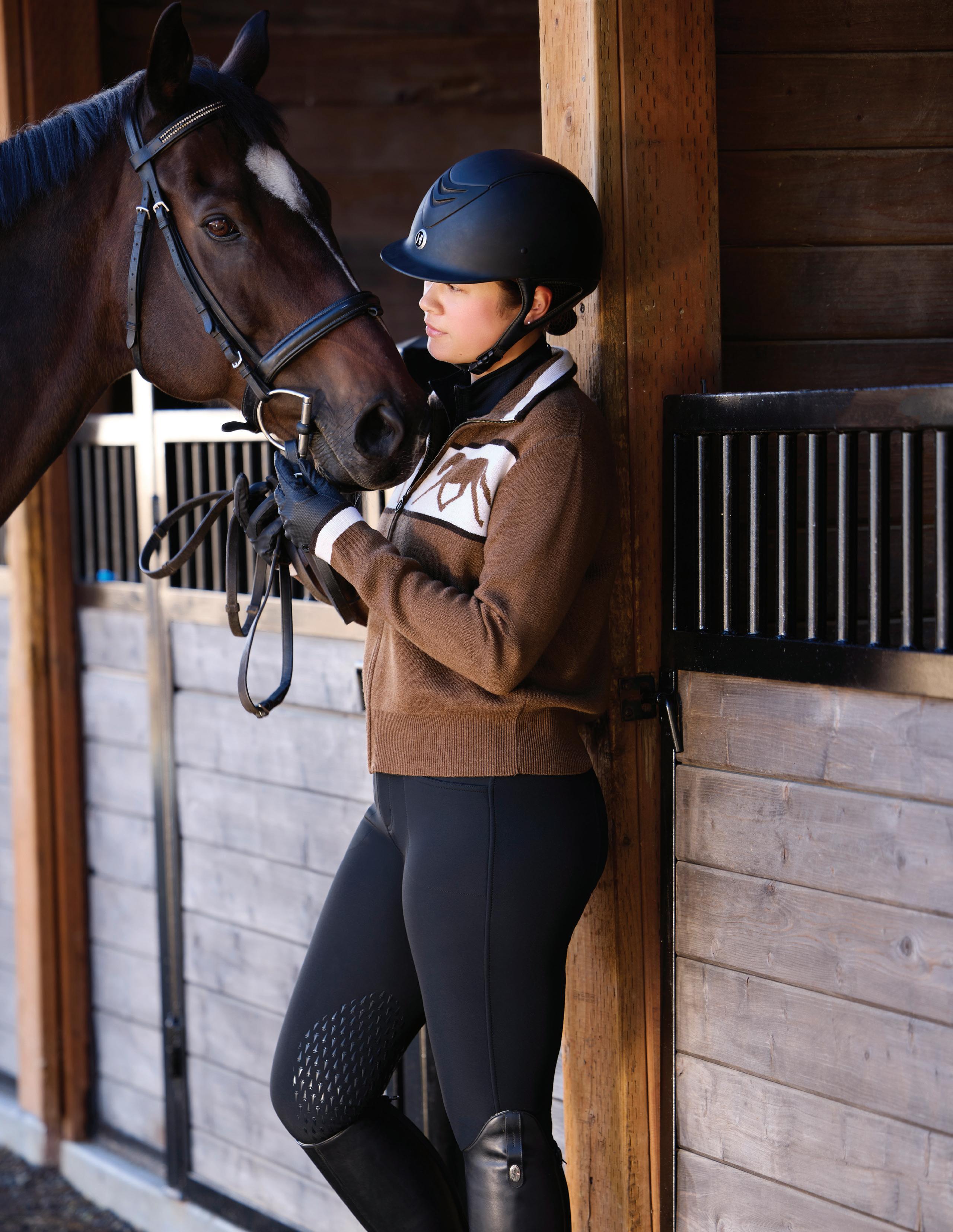 This cozy fleece top keeps kids warm through the chilliest barn days. A plush interior and soft, durable exterior deliver all-day comfort, while midweight stretch fleece allows easy movement. Finished with sporty stripes and Kerrits’ “Stormy Horse” print for cold-weather fun.