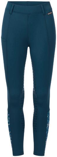 A step up in warmth and grip for when chilly weather tempts ponies to prance, these comfy kids tights are ideal for shoulder seasons. The lightly brushed interior insulates while supple Kerrit Sticks™ Silicone along the inner thigh and leg add grip. Fun contrast calf panels match their favorite prints. One side pocket holds treats for horse and rider.
