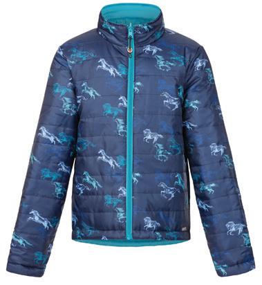 Perfect for cold weather layering. The softshell stretch panels down the sides and across the lower back are key to unrestricted movement, while the classically quilted core insulates for a versatile, wind and water repellent, three season essential. Tall, plush lined collar for tucking chilly chins. Fun horse print lining lets you flash a bit of style. Zip handwarmer pockets and two-way front zip for in-saddle performance.