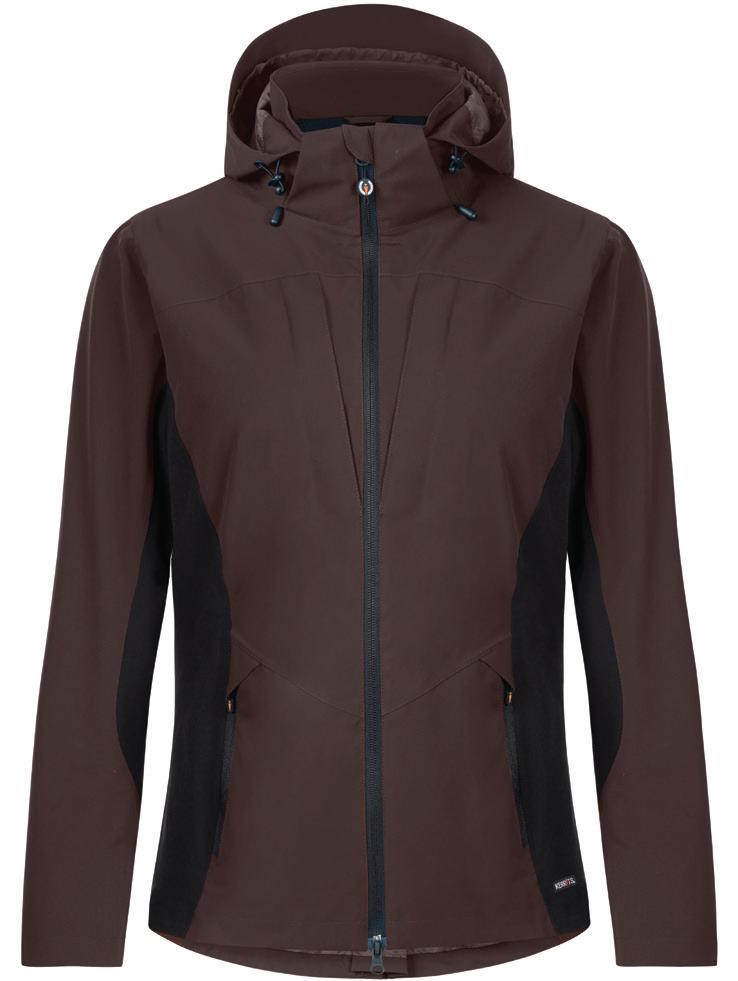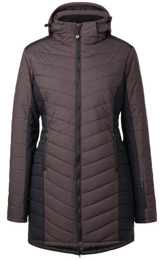 The stitching pattern on this lofty, wind and water repellant jacket spells out a snaffle bit celebration, anchoring 140 gram insulation that combine with stretch fleece panels along the sides and across the back for unrestricted movement and a flattering fit. Ergonomic elbow design eliminates bulk as you handle that other bit. Removable quilted hood prevents posthelmet chills; two exterior zip pockets and two hidden interior pockets stash your stuff.