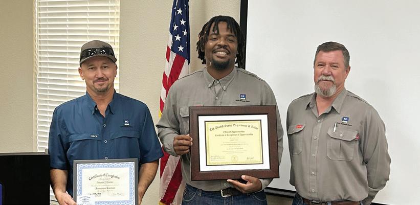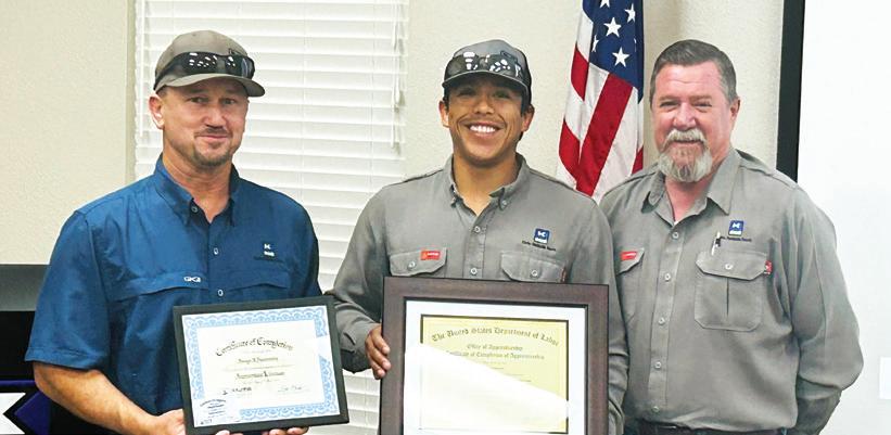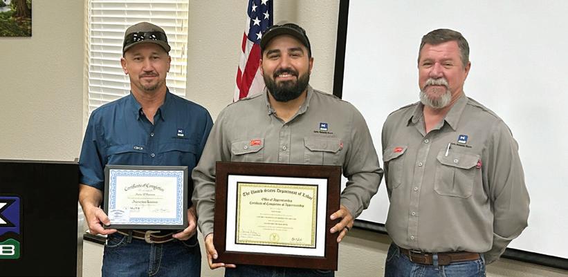 Photos: KPUB’s recent apprenticeship graduates: 1st row: Joseph Buenrostro (center), 2nd row: Nathaniel Crabtree (center), and 3rd row: Justin Martinez (center), pictured with KPUB Safety & Training Supervisor, David Burley (left) and KPUB General Foreman, Larry Lee (right).
