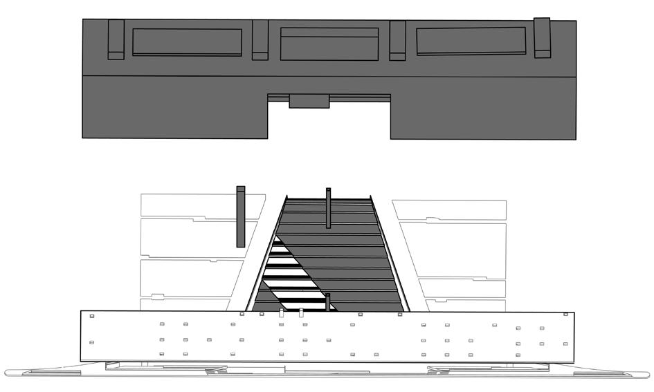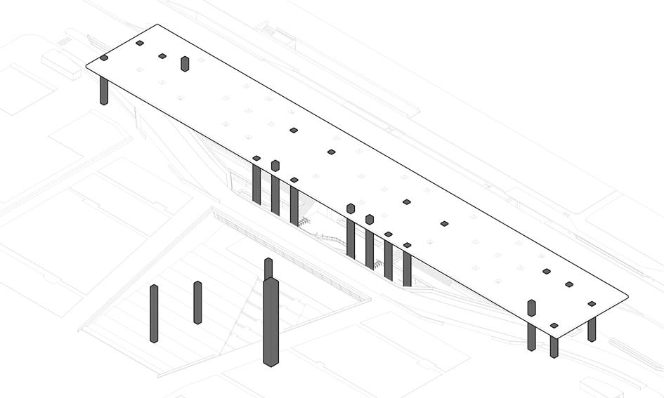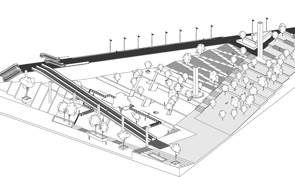 兩個對向的月台,我將面向市政府的捷運抬高,宛如聖殿一般,形成梯田景觀的一部分,另一個月台則埋藏於地底下。抬高的捷運月 台使公園和商業行為得以延伸進入地下站體,實現了捷運系統和廣場公園的空間與活動在立體上的交錯。