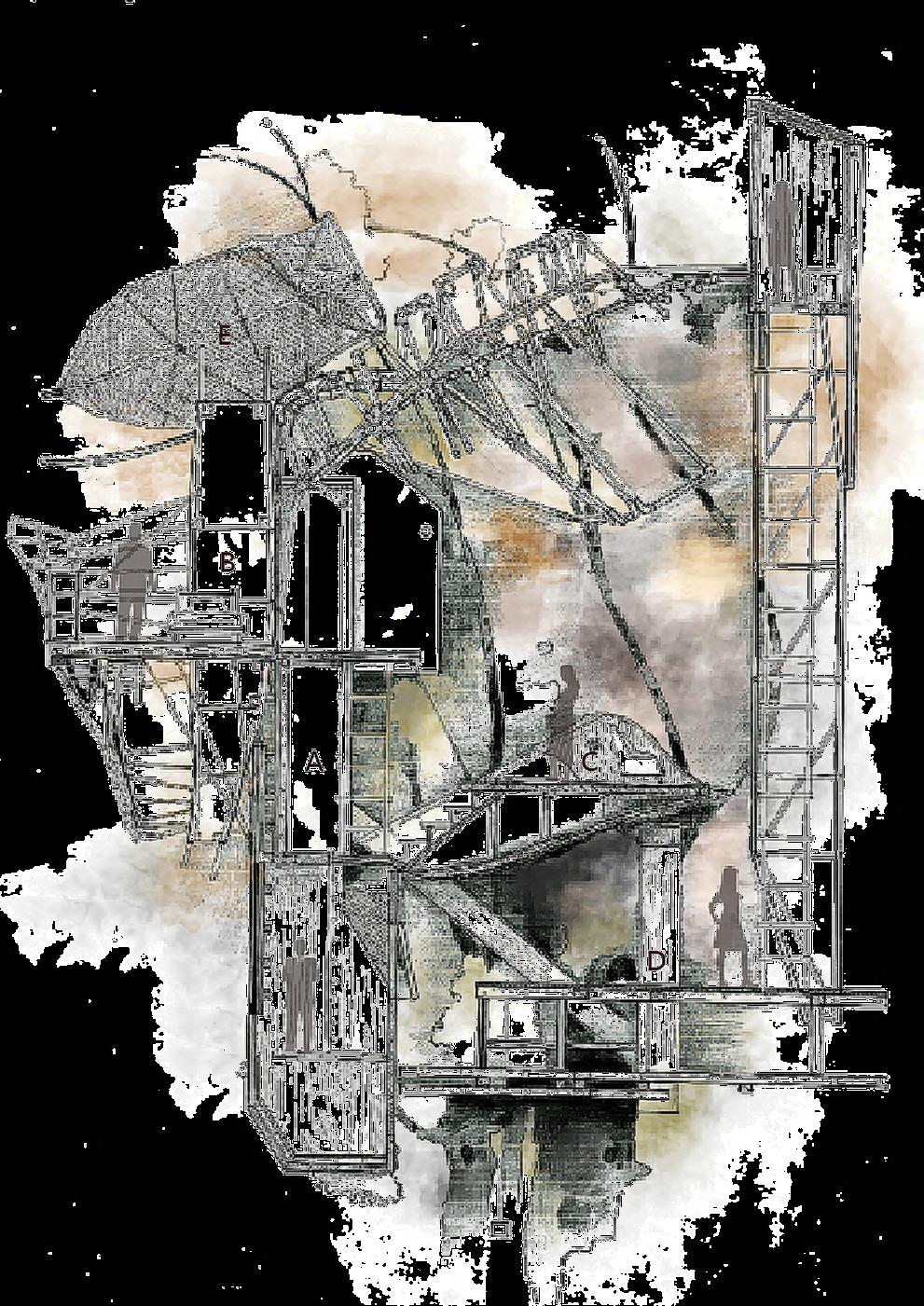 簡單的搭建於自然中,仍擁有基本需求的 機能,人在此裝置中能休憩、讀書,甚至 特定的時間點,裝置能成為自然的一部 分。在搭建與自然中穿梭的使用者,是空 間與空間之間的媒介,在無形中觸發可動 裝置使其互相介入。虛線與軌跡也暗示了 展開後的型態與走向。
