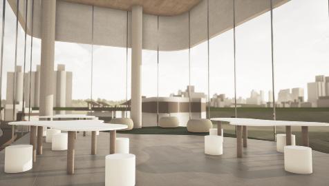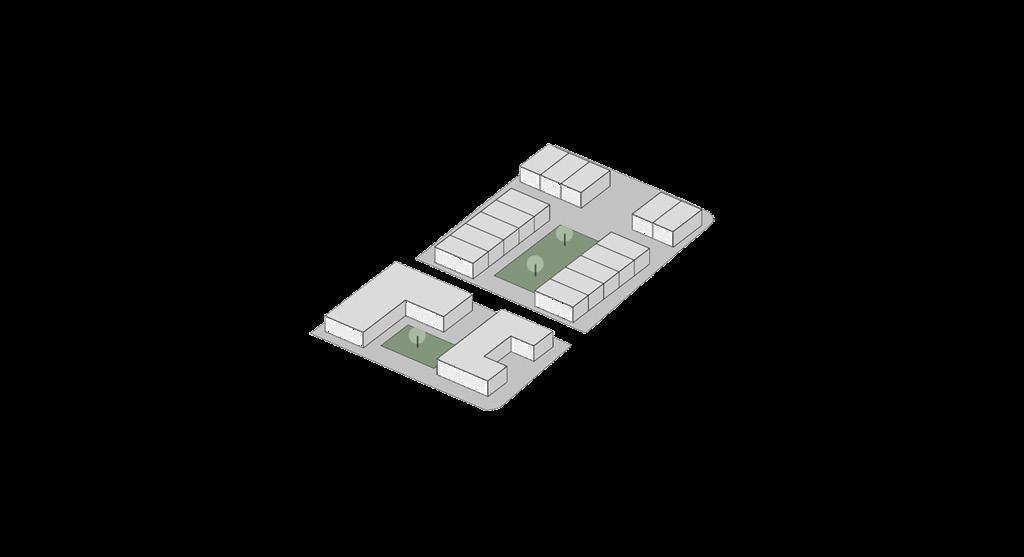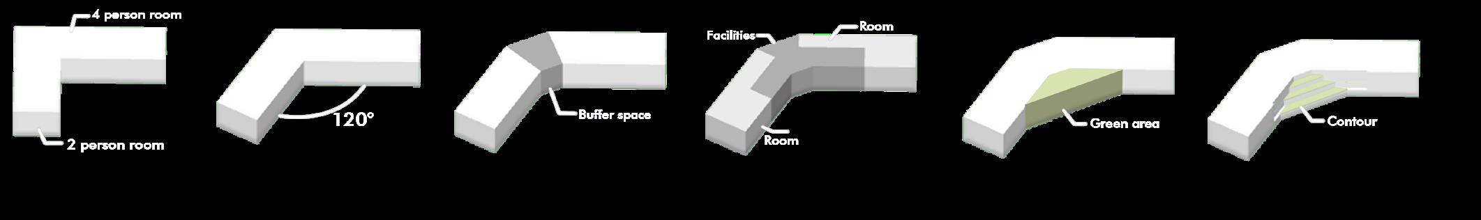 Derived from an L-shaped mass, this dormitory building is designed to form two separate areas for two different room types (2-person and 4-person rooms). The L shape creates a vast open space in the center of the building, allowing people to gather and engage in various activities. The open space has been expanded by 30 degrees, creating a 120-degree space, providing even more room. The two separate areas have a buffering space in the middle that serves as an indoor gathering space and public facility, with small gardens on each floor to provide a natural and green ambiance.