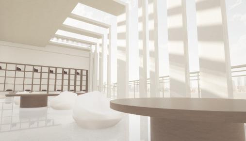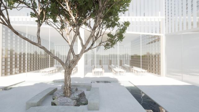The main entrance of the building leads to the pottery workspace. It has one long curved table for manual pottery making and several pottery wheels. The seats are facing each other so that visitors can interact with each other while making their pottery. The second floor of the workspace functions as a pottery exhibition space. The exhibition space is designed as a mezzanine, allowing visitors to observe the pottery-making process while appreciating the works of famous pottery artists.