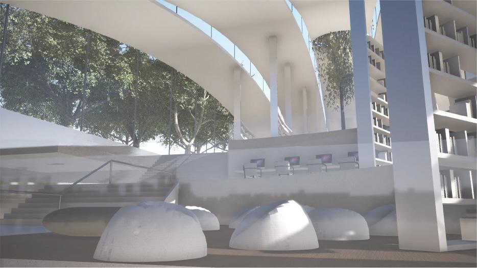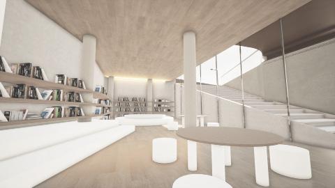 The first area of the library is the lobby which directly leads to the bookshelves area. The bookshelves have a flowy curved design to match the concept of the library and to have a better connection with the whole architecture concept. Visitors can sit and read in the floor reading area located between the bookshelves.