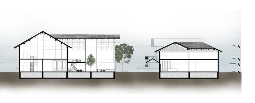 entrance to this building is divided into two. The main entrance leads directly to the counter, and the second entrance leads to the café area. The basement, which functions as a library, theater, and office, can be directly accessed from the outdoor stairs. The mainly used as a cafe and bakery, both of which are related to food and beverages. The second floor is mainly used as a playground, divided into two sections. The first section focuses more on learning, while the second section focuses more on mainly used as an outdoor playing area and an art classroom.