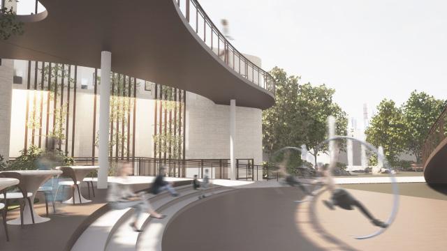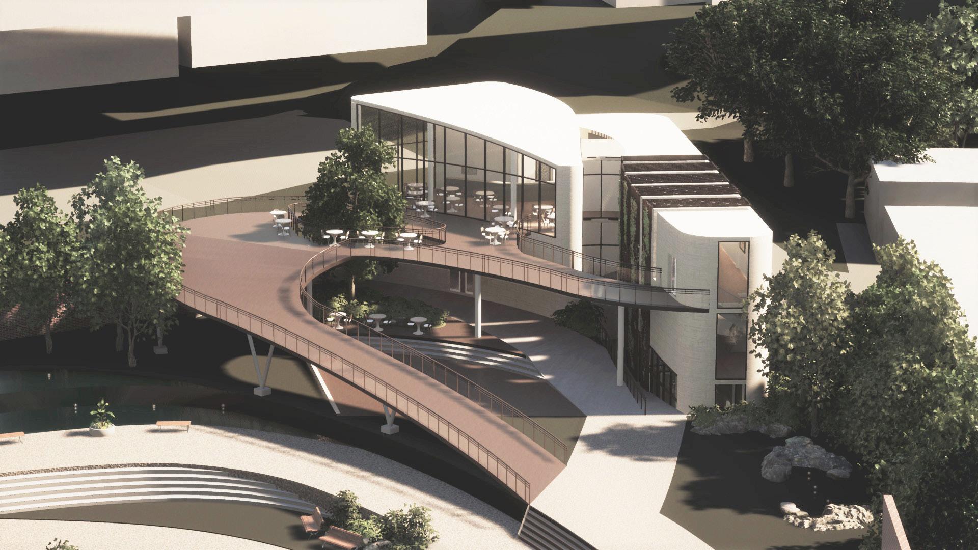 are several stairs between the pathways that creates different tracks for people to walk. Besides stairs, ramps are also designed for people with disabilities. The landscape itself has several spots with different functions such as parks with benches for people to seat, waterfall , and water fountain for kids to play.