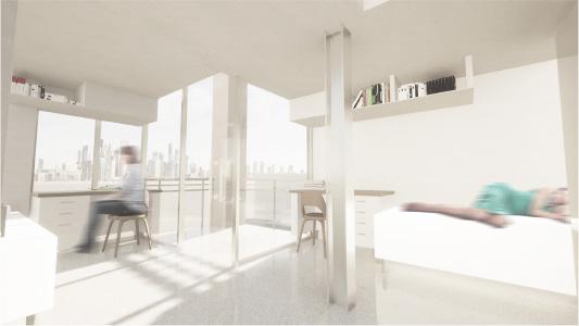 The 4-person room is divided into two floors, accommodating 2 persons per floor, each having their own bed, table, and shelf. The 2-person room has a simpler design with no floor seperation. Each floor has different facilities, including a gym on the second floor, a recreation area for playing billiards and ping pong on the third floor, and a board game area on the fourth floor. In addition to these facilities, every floor except the first has its own study room. Finally, a rooftop garden is available on the top floor for people to hang out.