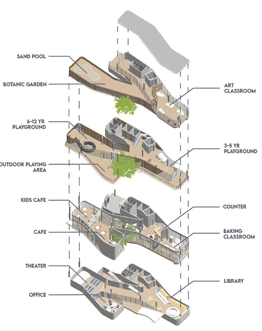 design concept of this building is inspired by two hands that are connected, representing a mother’s and hands connected to protect their child. There are four floors in total, including the basement. The library, theater, and offices are located in the basement. The cafe and baking class are located on the first floor. The playing area is located on the second floor, which is divided into two sections for children aged 3-5 years and 6-12 years. The art classroom is located on the third floor with an outdoor activity area. The wooden façade on the second floor is designed to reduce sunlight and heat so that children can play comfortably.