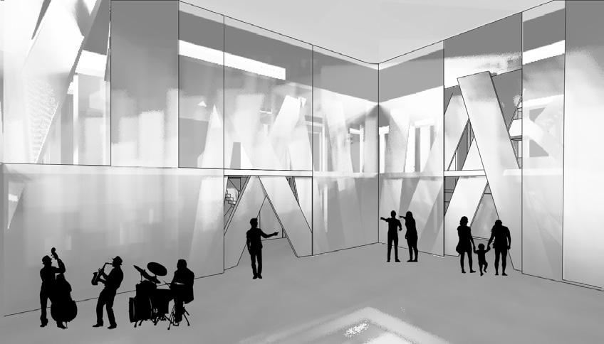 Project : Mixed Media Building (Library, Gallery, Theater) designed with system of load bearing walls dividing programs, creating spaces and titling toward entrances