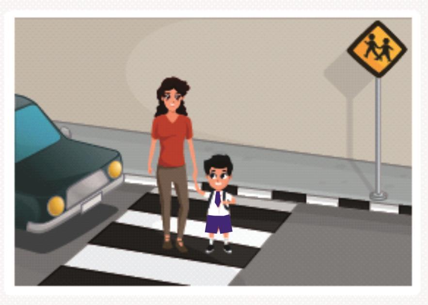 Memegang tangan pendamping untuk menyebrang, dan pendamping selalu berada pada sisi yang melindungi anak