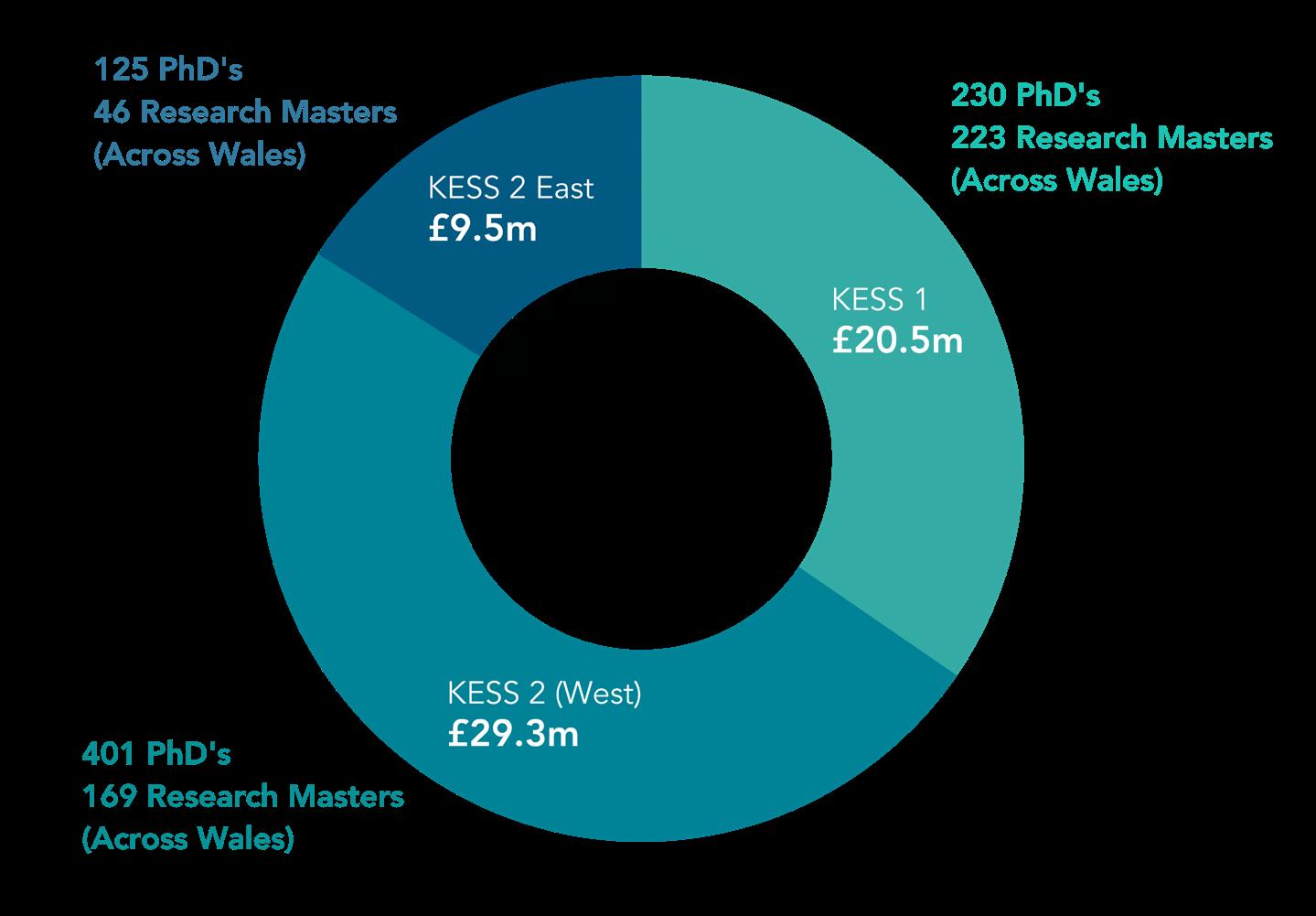 SCOPE & SCALE Funding EU Grant Across Wales Cost Per Participant PhDs Research Masters PhDs Research Masters KESS 1 : 2009 - 2015 £31.5m £20.5m 230 223 £100,345 £29,576 KESS 2 : 2015 - 2023 £40.3m £29.3m 401 169 £81,663 £24,008 KESS 2 East : 2019 - 2023 £16m £9.5m 125 46 £72,864 £21,348 Total Funding £87.8m Total EU Grant £59.3m Total Projects 756 438 8