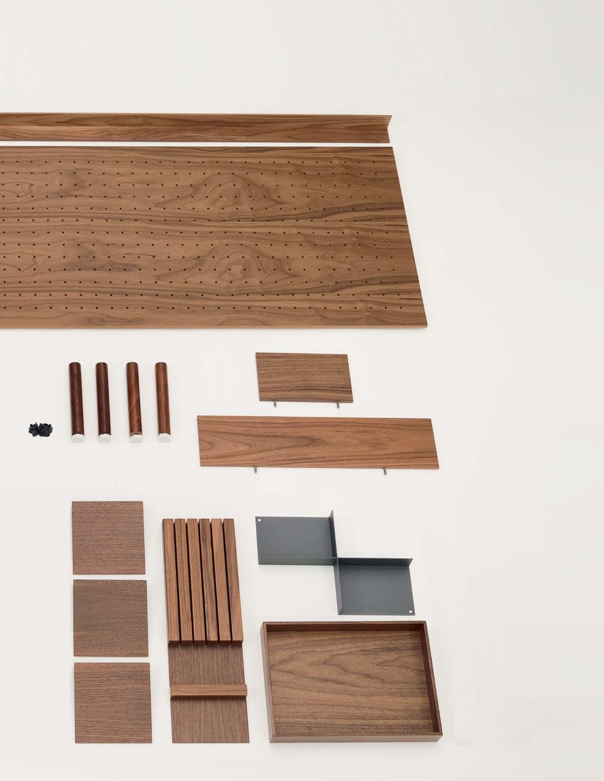 Plate rack, Box with grip holes, Cross divider and Felt mat are used to create separate compartments within the Open frame without Perforated panel. Each piece is ⅓ of the width of a shelf. Each item sold separately. See next page for popular Lavido set combinations.