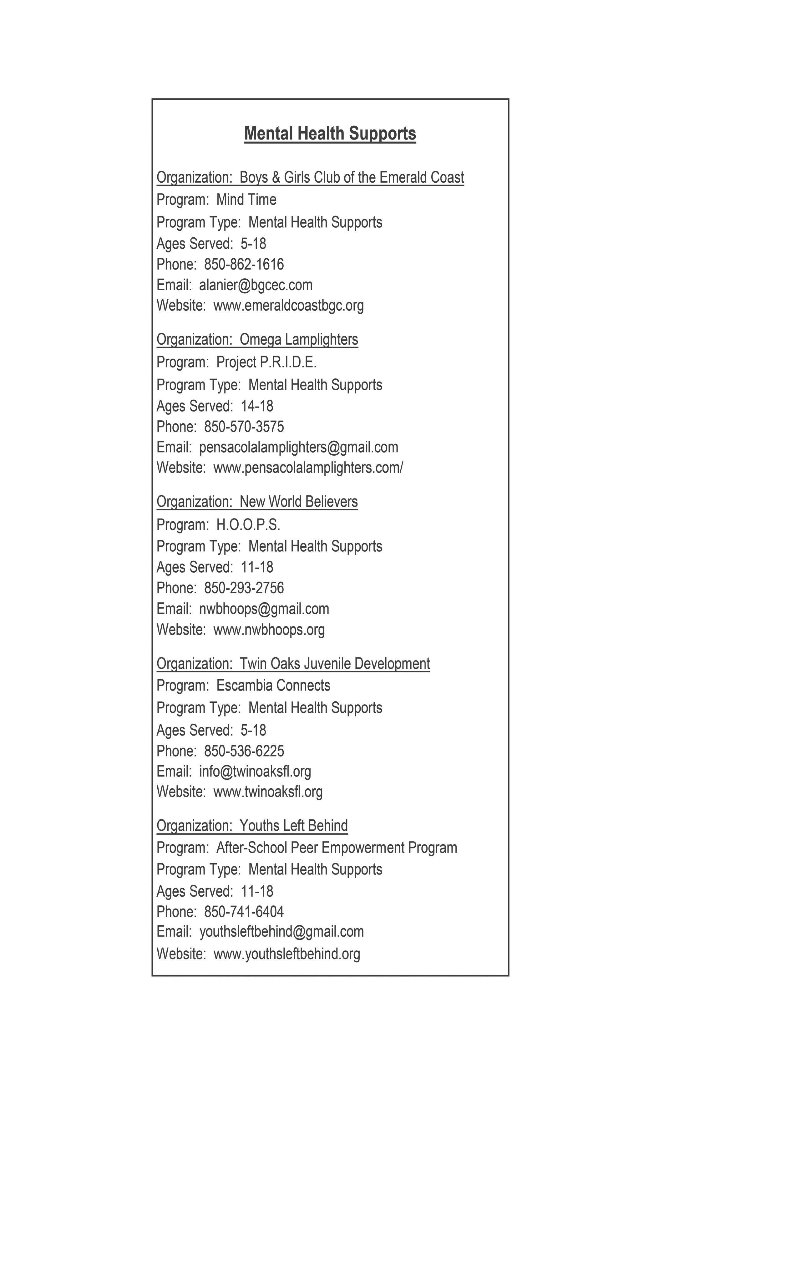 Information is current as of March 2024. Providers wishing to update their information should contact Michael Moore at mmoore@escambiachildrenstrust.org.