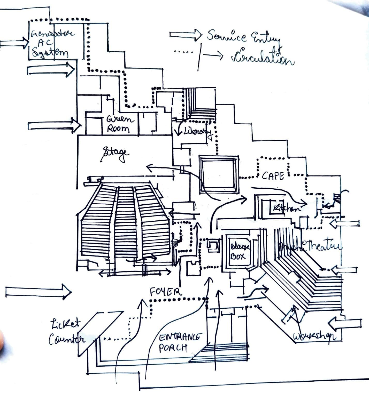 Circulation linked to the zoning is segregated through levels - ground floor for audience functions and first and second floor for staff and students with degree of inter linking.