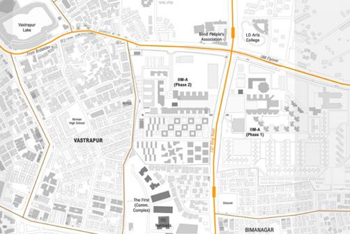 NEIGHBORHOOD: IIM is situated on a 66acres site to the west side of the city of Ahmedabad. It is about 10 km away from the railway station and about 15km away from the airport. The institution lies near to other institutions namely Atira and Gujarat university.