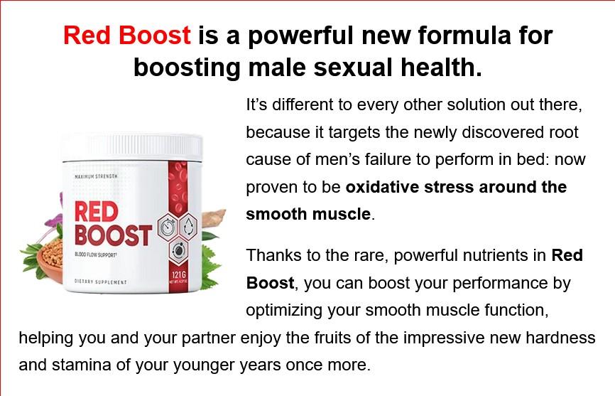 Red Boost is a premier dietary supplement designed specifically to support men's sexual health and vitality. Developed with a potent formula, RedBoost aims to address common concerns like low energy, reduced stamina, and performance issues.Proudly made in FDA-approved facilities in the USA. designed to optimize blood flow and restore vitality, this dietary formula harnesses the power of vitamins and nutrients to provide sustained energy support. to get It, just go to the official website and learn more or order your supply today.