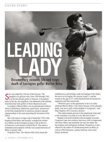 he was called the “Flower of the Fairway,” the daughter of a golf pro who, from 1936 through 1941, was the best female golfer in America. A household name in her day, her popularity was enhanced in the absence of professional male golfers in those Depression years. Lexington’s Marion Miley was an international celebrity whose youthfulness, athleticism, good looks, and prowess on the links propelled her to numerous amateur regional championships in the years preceding the formation of the LPGA. But it all came to a tragic end in September 1941 when burglars killed Miley and mortally wounded her mother in a robbery at the Lexington Country Club on the eve of America’s involvement in World War II. The nation’s immediate preoccupation with the war caused memories of Miley to quickly fade. Forgotten Fame: The Marion Miley Story traces her 4