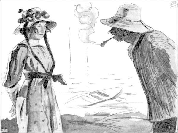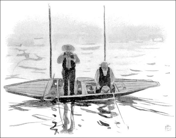 Elle lui trouve belle mine sur sa barque: le Chinois à côté ne lui vient pas à l’épaule: et tout à coup il jette la ligne: la ligne caracole en lacets et semble vouloir décrocher les petits nuages roses du ciel.
