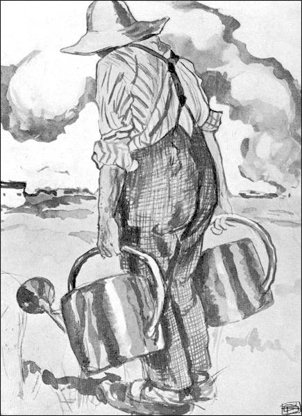 Il arrivait que M. Fauche, impatienté, tout à coup toussât derrière la haie de son jardin. Aussitôt Tantin empoignait ses arrosoirs et à lents pas lourds, emplissant à mesure ses sabots larges comme des barques, il se remettait à talonner vers la maison. Fré D’siré haussait les épaules, méprisant, comme pour lui reprocher sa servilité.