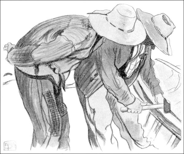 C’était le temps des derniers repiquages. Jean Fauche, au petit jour, descendait jusqu’à la marine. Il humait un instant la senteur musquée du fleuve, bourrait sa pipe à long tuyau de merisier, heureux, détendu à la fraîcheur matinale. La chemise bouffante au dos, en braies larges de terrassier, il prenait ensuite son plantoir et fonçait de petits trous où il