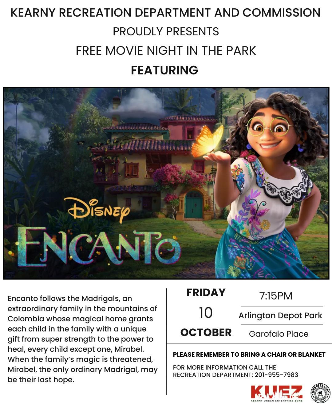 The Town of Kearny’s Recreation Department hosts a free screening of Disney movie “Encanto,” Friday, Oct. 10 at 7:15 p.m. at Arlington Depot Park. It’s all part of the town’s Hispanic Heritage Month celebration. Remember to bring a lawn chair or blanket.