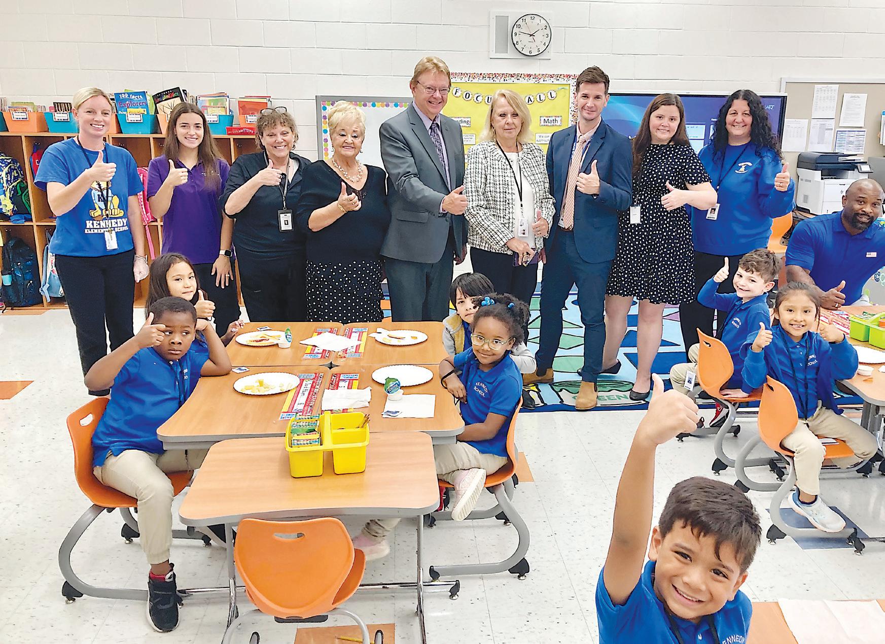 Wholesome and nutritious foods, made available through the Fresh Fruit and Vegetable Program (FFVP), make a tasty afternoon snack and are conducive to enhanced learning. Joining the first graders at Kennedy Elementary School are (left to right) Lyndsey McQuillen, Alexandria Caruso, Cathy DePrisco, Maria Vila, Michael Pichowicz, Maureen Kroog, Kevin Stahl, Teresa Bershefski, Kim Huaranga and Ricky Holloway Jr.