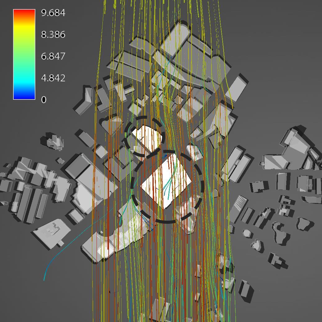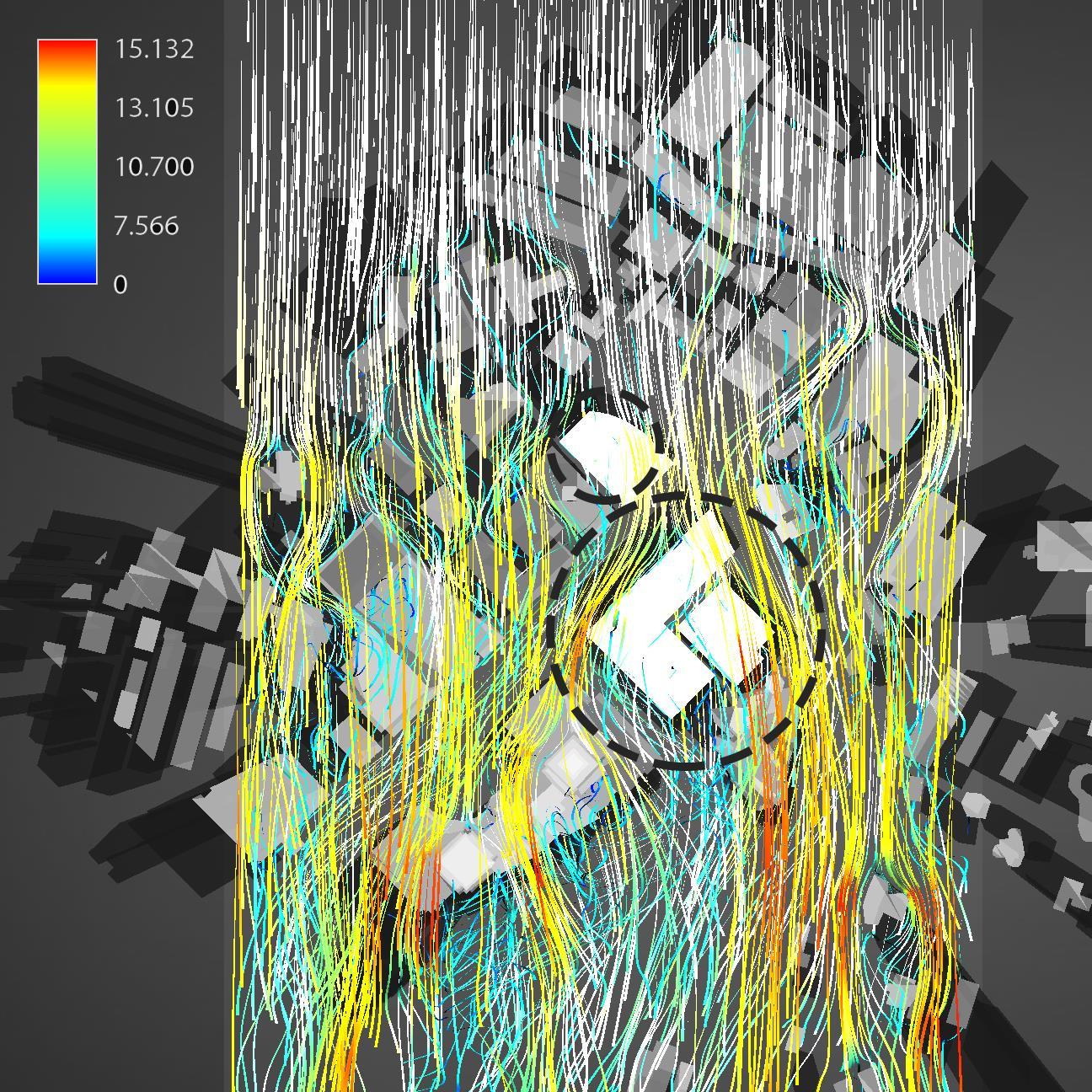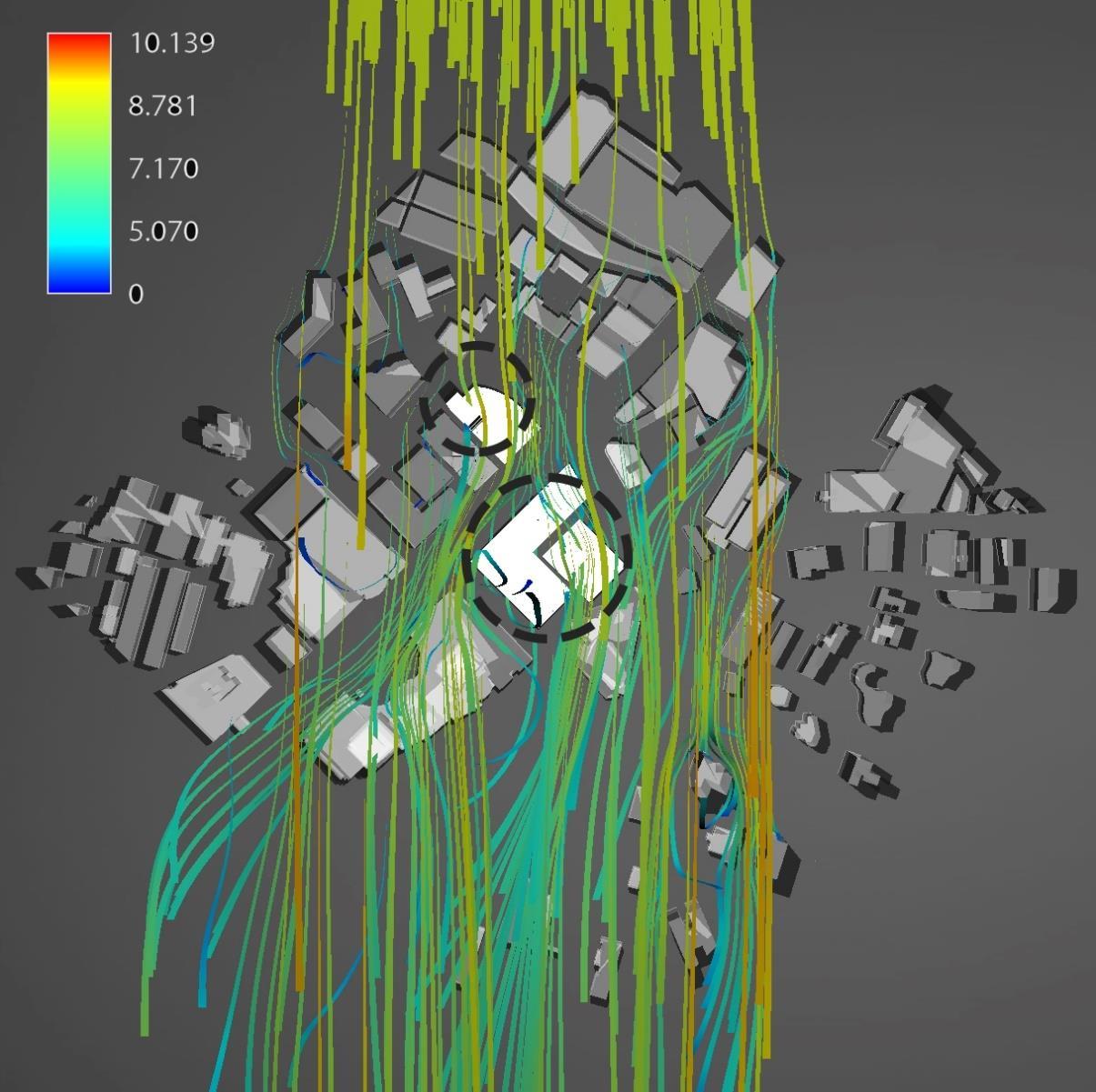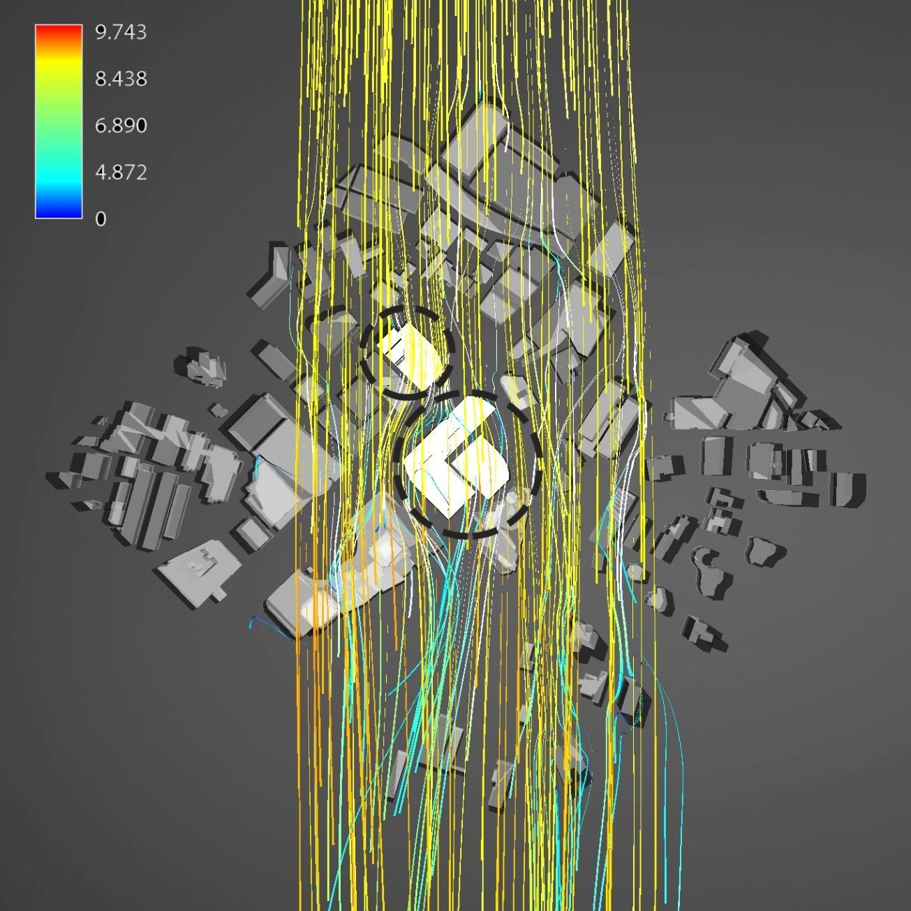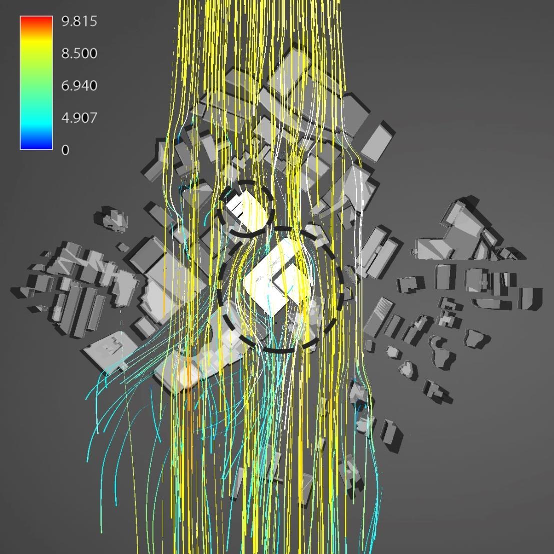 The simulation test confirms that the hypothetical airflows are incorrect. This may be due to the presence of large cavities between the individual towers where they do not encourage much wind permeability. The figure illustrates the direction of flow lines below: