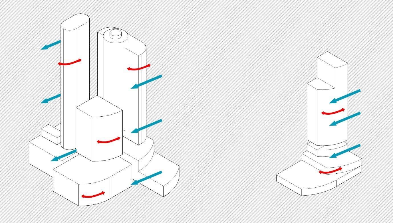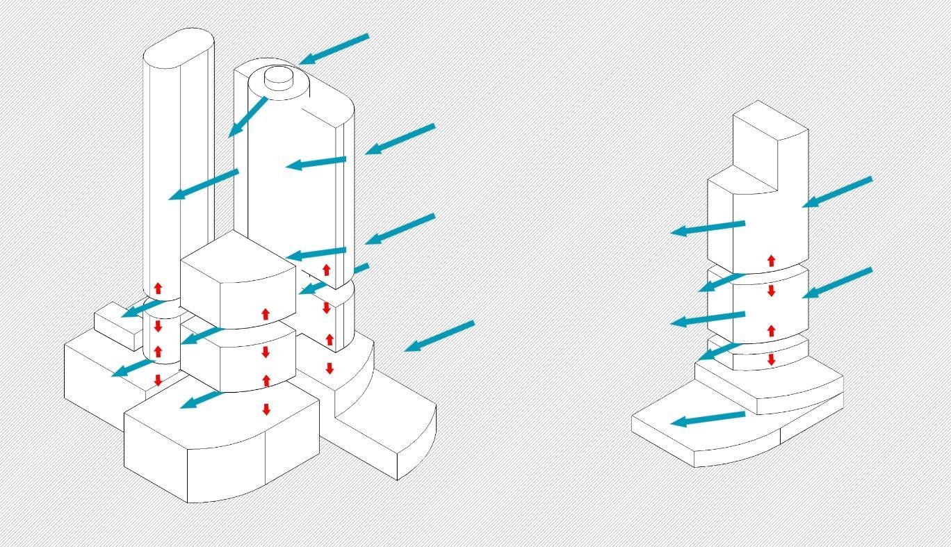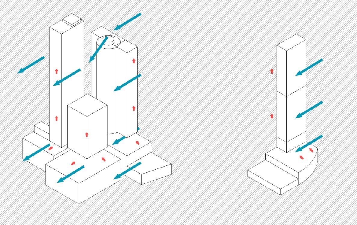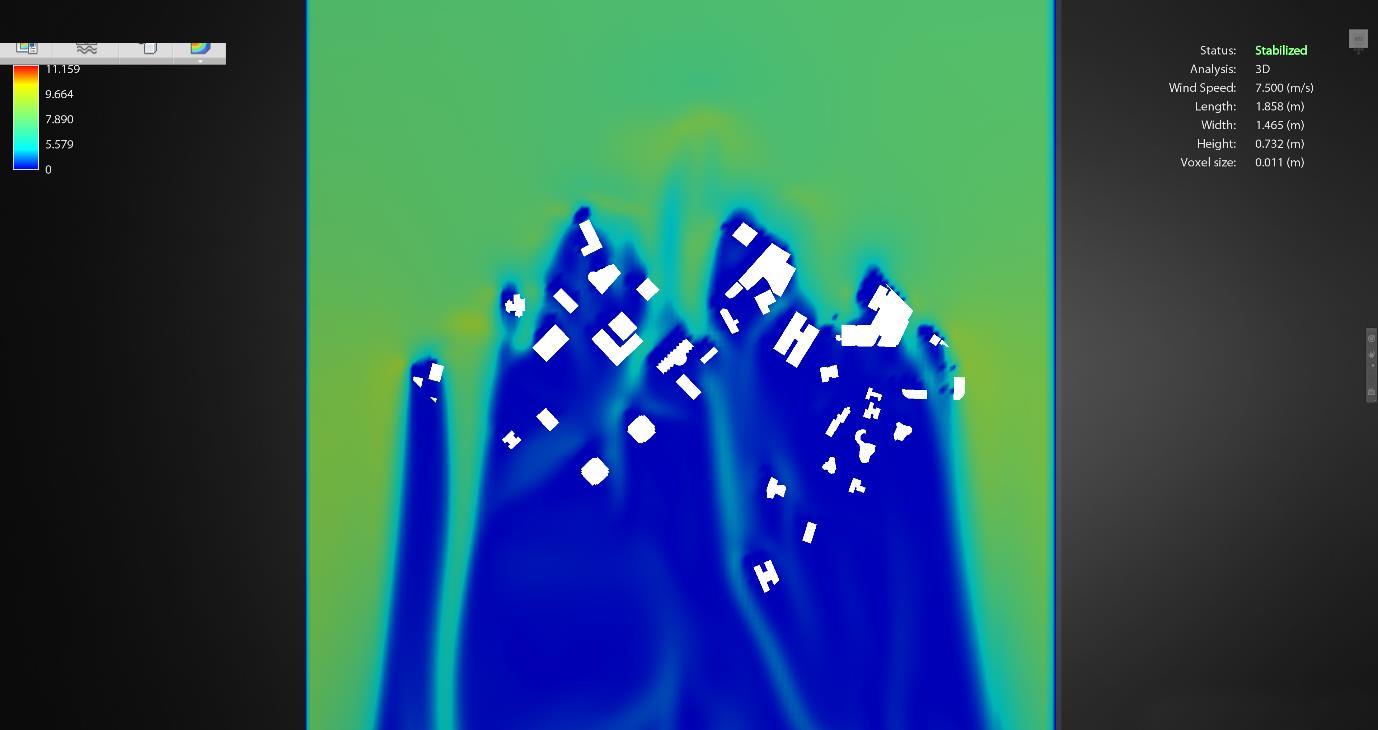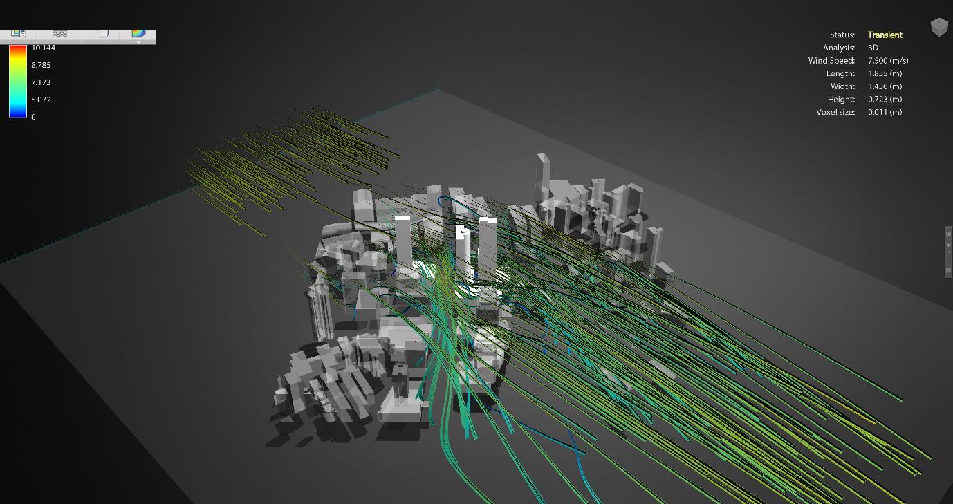 The simulation test confirms that the hypothetical airflows are incorrect. This may be due to the presence of large cavities between the individual towers where they do not encourage much wind permeability. The figure illustrates the direction of flow lines below: