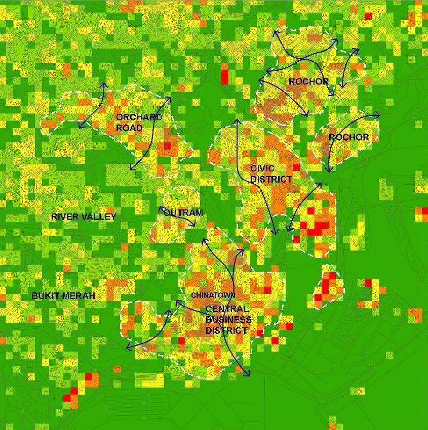 The simulation test confirms that the hypothetical airflows are relatively correct. The narrow and tall tower block helps to dictate the inflow of NE prevailing winds, noticeability to the walkways along Orchard Road, the green plot behind Ngee Ann city and areas behind the target buildings. The figure illustrates the direction of flow lines below: