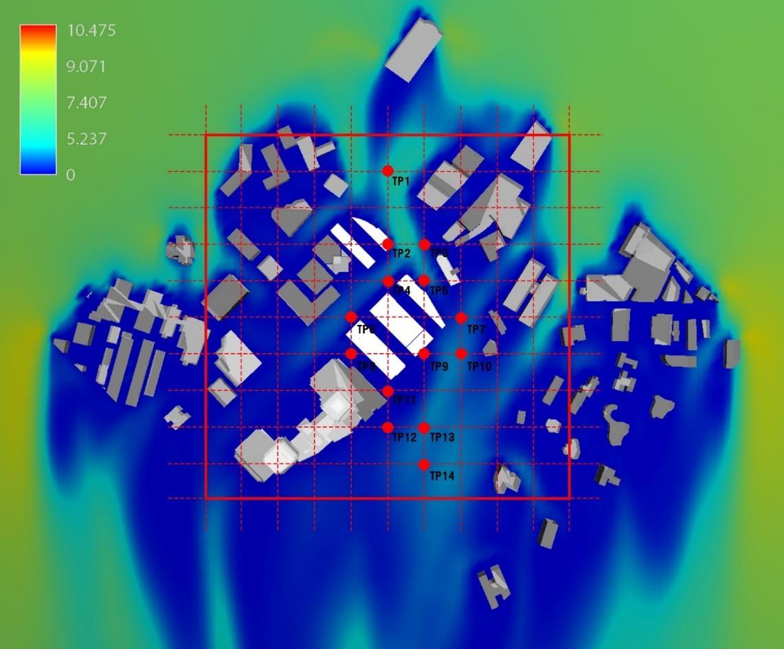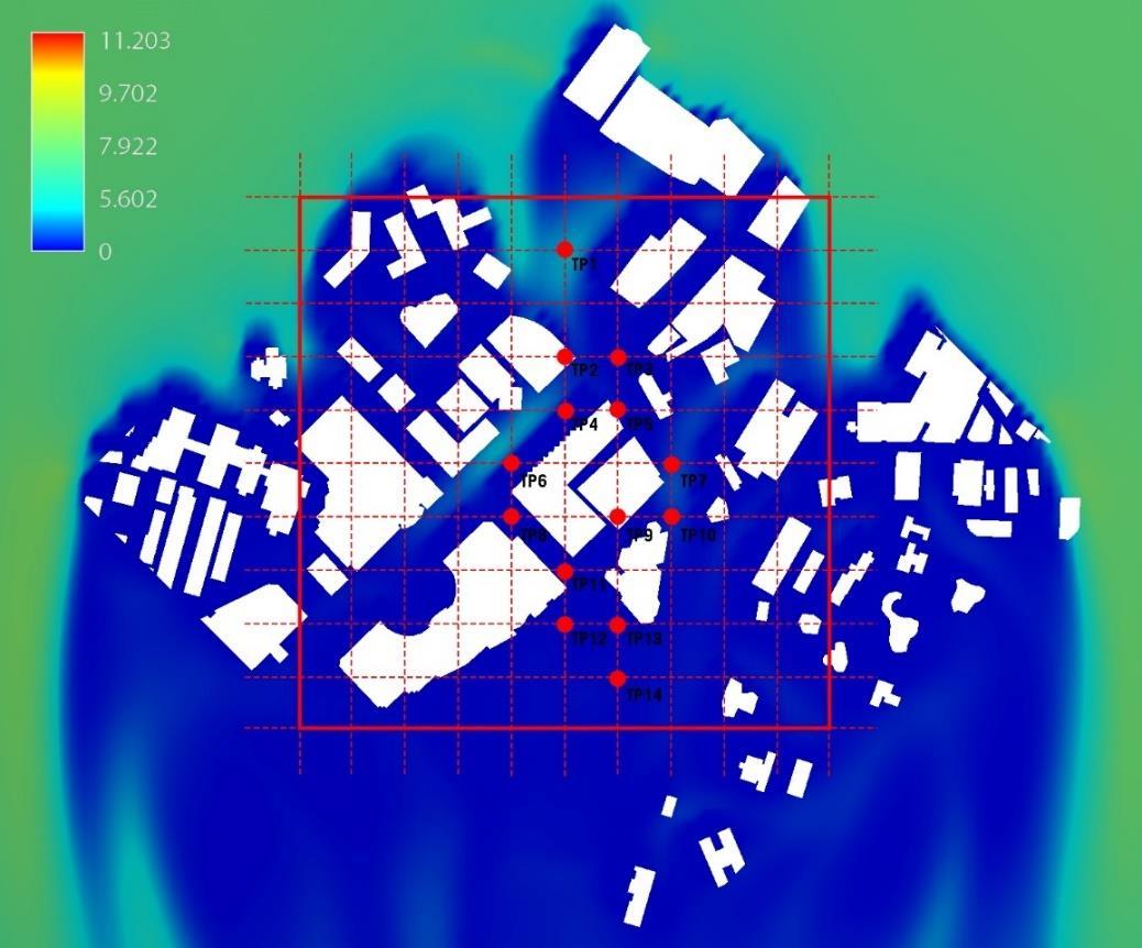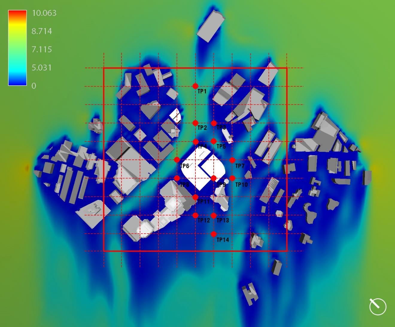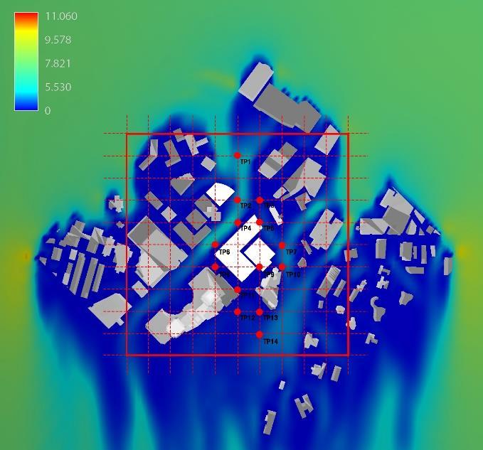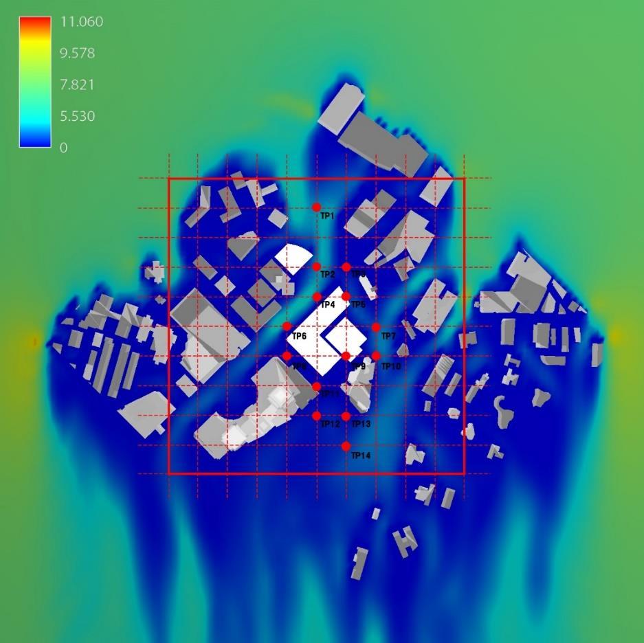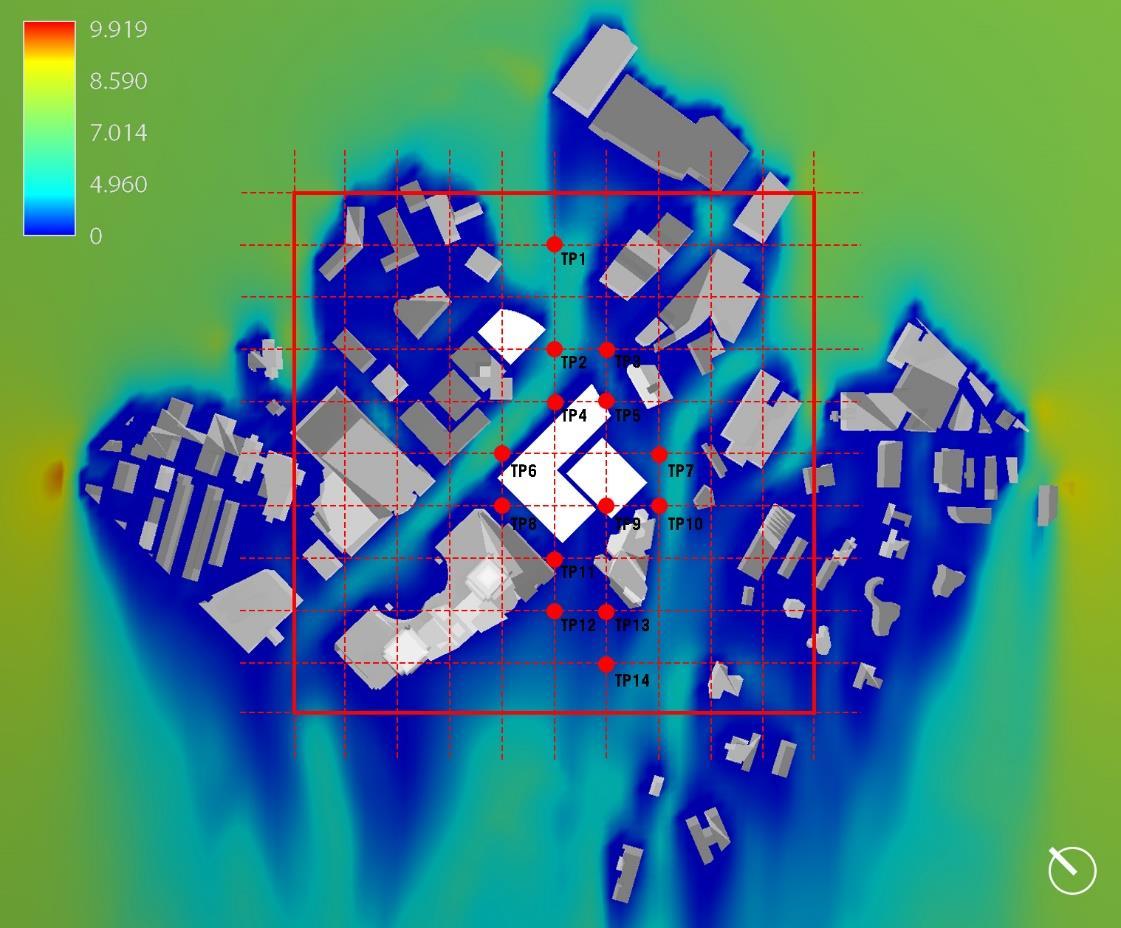 The location of test points is positioned in the 50m grid form. The grid is orientated towards the direction of North-eastern prevailing winds. Here, 14 test points are utilized and distributed on the range of 200 metres from the target buildings. The figure below, displays the superimposing of test points on podium level where there is a high presence of human traffic. The readings of test points are recorded in Table 2.
