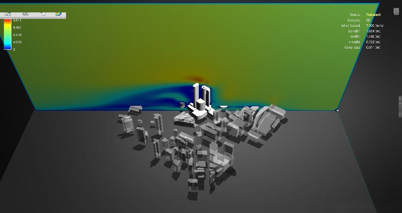2 The importance of the 2D slice offers a wind calculation at the determined location, horizontally or vertically. The plane delivers a more precise representation as compared to the 3D simulation of flow lines. In addition, the cross-section of wind tunnel allows the user to examine wind profile at three layers, podium level (15m), building layer (15-60m) and urban canyon layer (>60m). The following figures are screenshots of cross section plane at three layers.