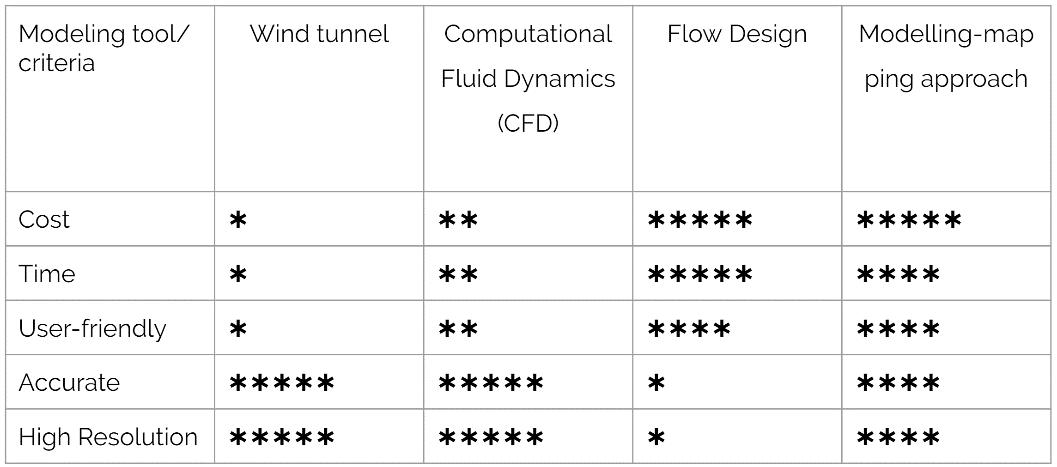 The considerations of modelling tool and simulation selection lies on five underlying factors: Cost, Time, User-friendliness, Accuracy of results and Resolution; along with the focus of the report. The report primarily emphases on the student’s methodology of analysing, evaluating, providing iterations and selecting the most ideal massing strategy. Instead of the student’s capabilities on handling complex software which consumes long periods of time to generate accurate results. The basic criteria of selecting software should be able to analyse the wind permeability, airflow direction and wind velocity. The available modelling tools are listed and compared below: