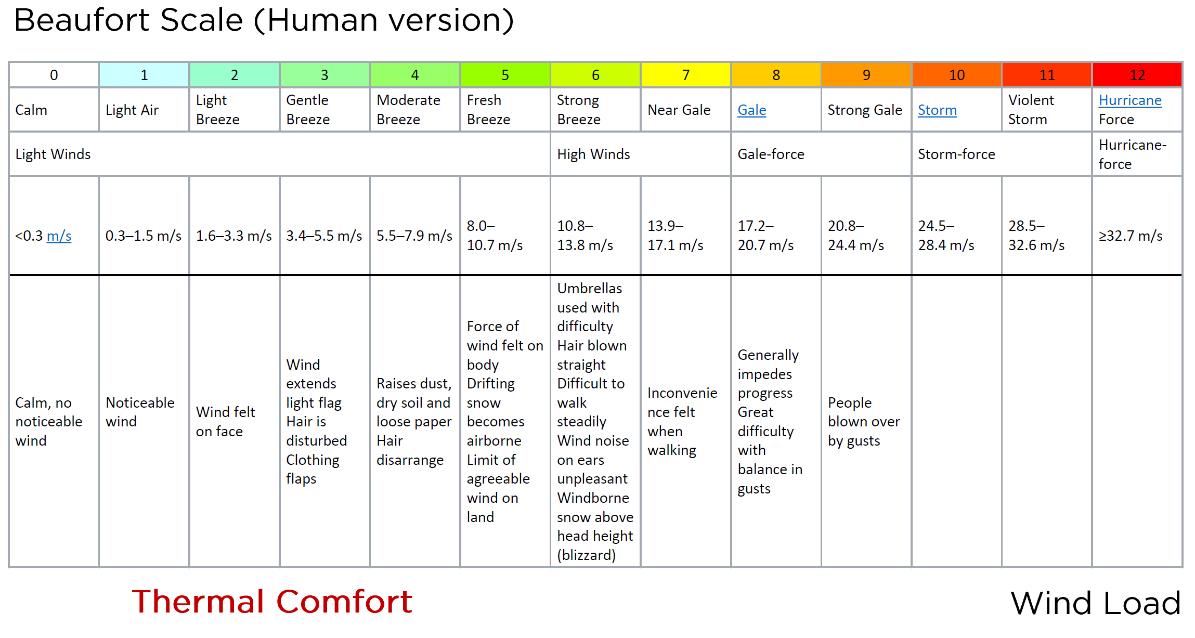 The analysis looked at potential air paths through the formation of low permeability clusters. Airpaths are generated by the direction of prevailing winds and sea breezes, allowing airflow to ventilate deeper into the city. As a consequence of the urban densification, the potential airflow has thus been impeded. The figure above provides a table of standards, suggesting a relationship between thermal comfort and wind load.