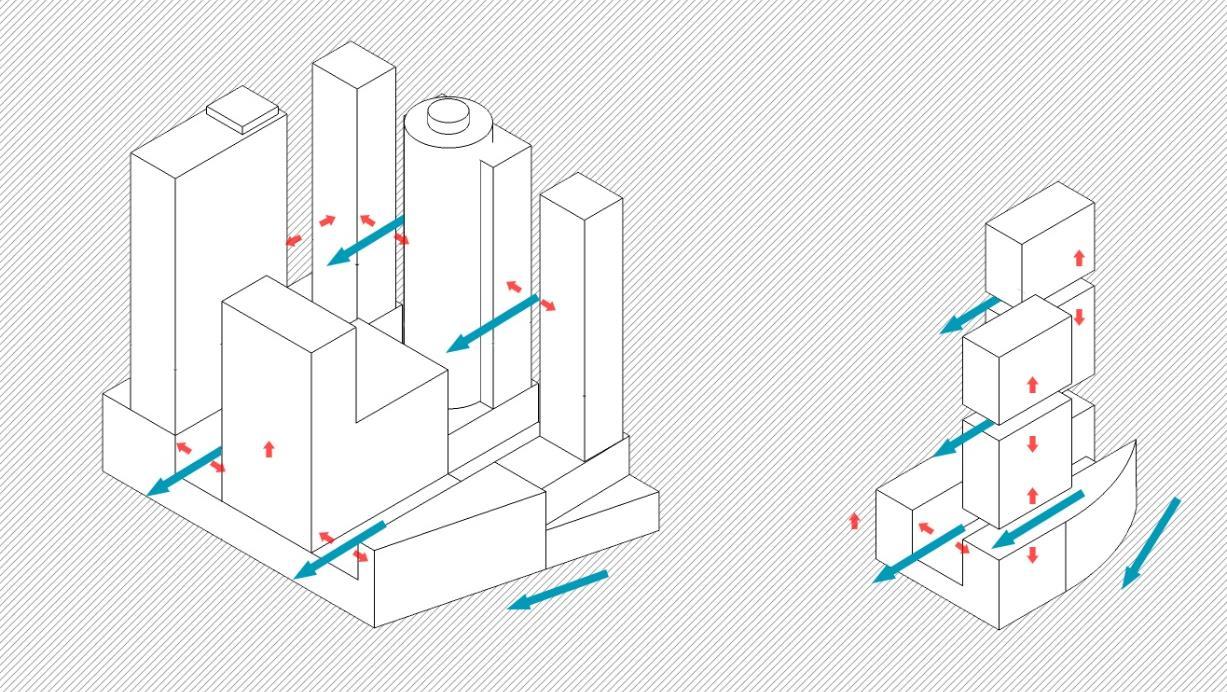 The second iteration involves the utilisation of vertical porosity. Similar to the previous iteration, the implementation of porosity aims to improve wind permeability and potential airpaths through the urban context and target buildings. The target buildings are fragmented and split vertically (1) between the individual tower block of Mandarin Orchard (2) tower block of The Heeren The tower blocks are then re-positioned on the podium with cavities in-between. The distance between building block is approximately 15-20 meters. Additionally, ‘Valleys’ are formed across the podium blocks, allowing wind to permeate. Similar, the design of the target buildings forms a relationship of dependency. The figure above shows the hypothetical airflows that demonstrate how wind may be travel through the vertical cavities.