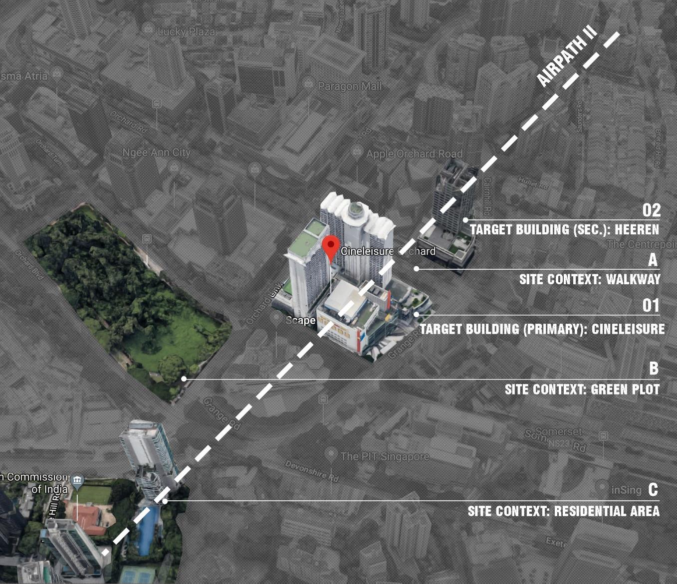 Based on the analysis on Airpath II, two target buildings are identified. The considerations of selection are established on two factors, 1. Building positions which hinder the direction of prevailing winds. 2. Buildings with high ground coverage ratio. The primary target buildings, Mandarin Orchard hotel and Cineleisure shopping mall, consist of two 110m rectangle block