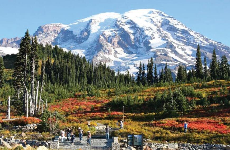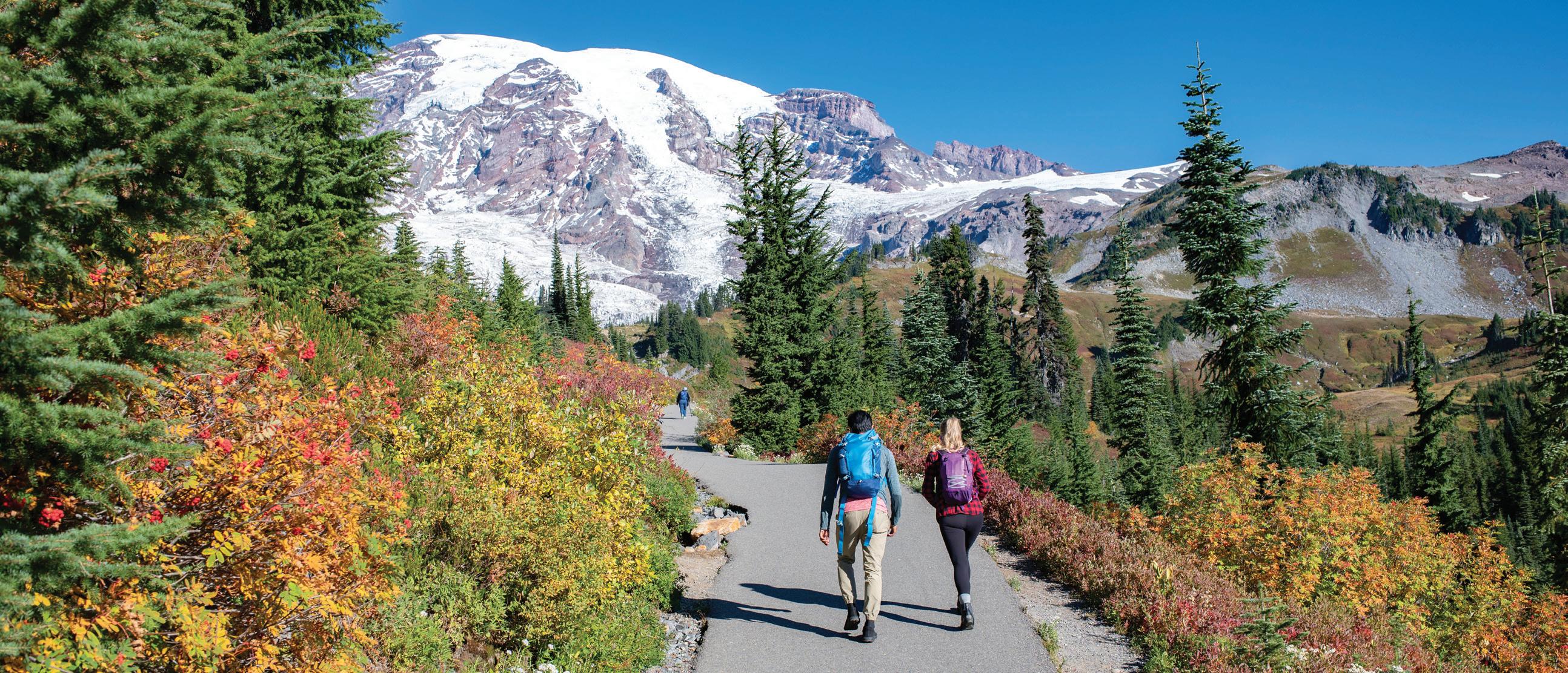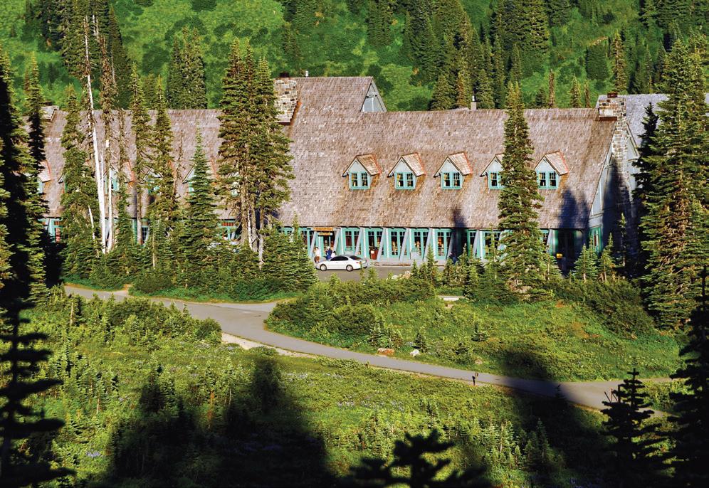 Rainier Guest Services is the entity that includes the majesty of Mount Rainier, its recreation and lodging. ink 236,000 acres of national forest inlaid with trails that go on for hundreds of miles. Fall is Mount Rainier’s finest season for hiking. Try the Nisqually Vista Trail from Paradise Lodge, a 1.2-mile loop with stunning views. Don’t miss Skyline Trail for a more challenging 5.5-mile loop. Or Naches Peak Loop, a 3.5-mile stunner that may offer late summer glimpses of wildflowers. History and lodging come together at Rainier. Paradise Inn was built in 1917 and sits grandly at 5,420 feet. It closes in October when snow makes it difficult to approach. National Park Inn, open year round, was built in 1926 and, with twenty-five guest rooms, is