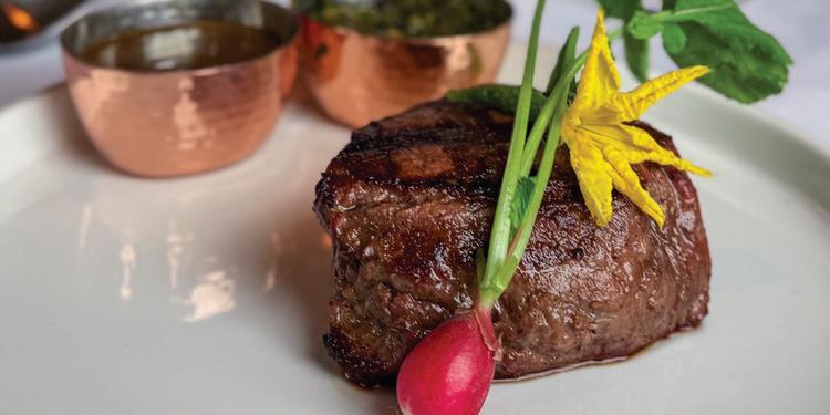 At the lodge’s restaurant, the menu includes bourbon-glazed buffalo meatloaf.