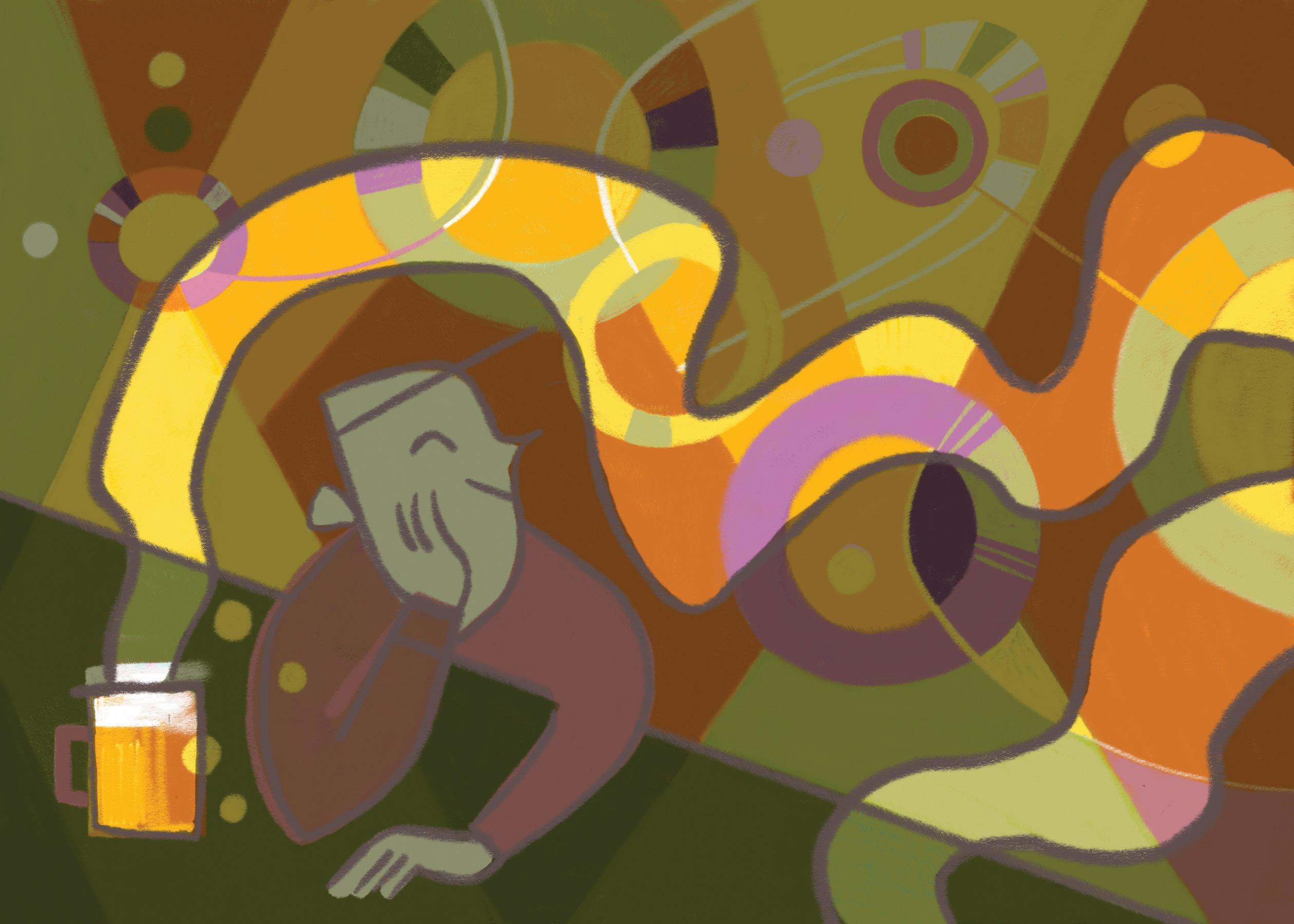 “It was a beautiful bit of serendipity to receive this issue’s Beerlandia assignment as I’m a big fan of jazz anyway. When I listened through Jeremy Storton’s playlists, I kept thinking about Sadamitsu Neil Fujita’s work—the Mid-century artist who painted many album covers in that era, perhaps most famously Dave Brubeck’s Time Out. I liked the idea of paying homage to him by incorporating design elements that speak to his work. I wanted to capture that feeling you get when you’re zoning out to good music as you unwind at the end of the day.” (pg. 20)